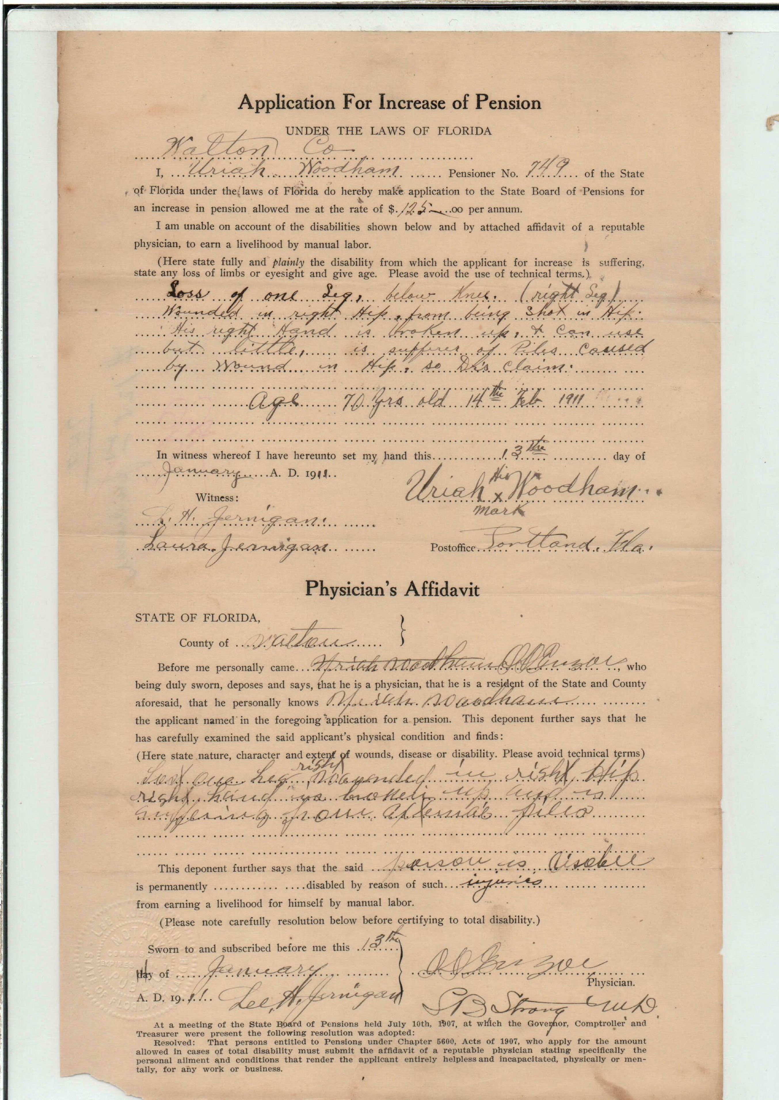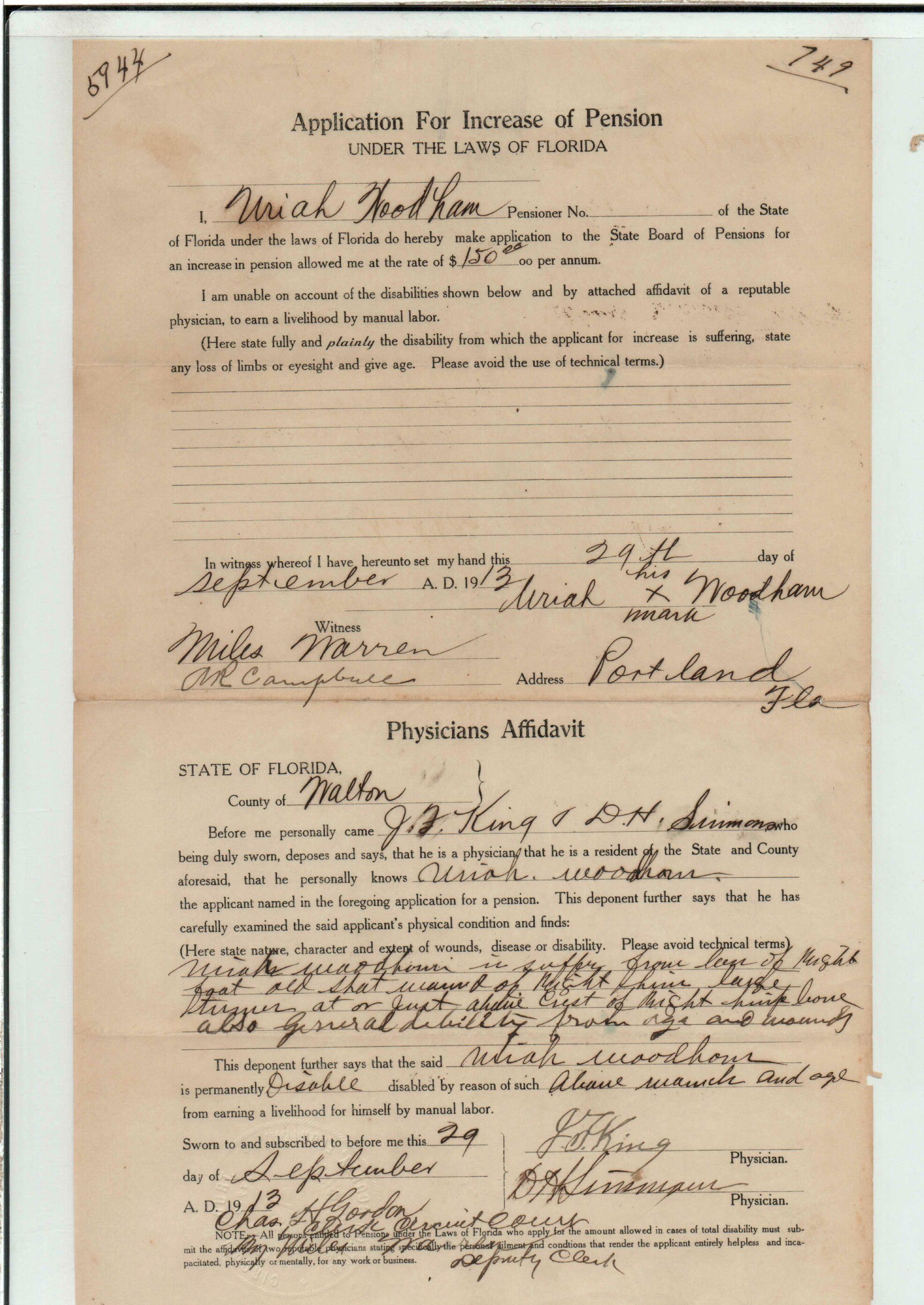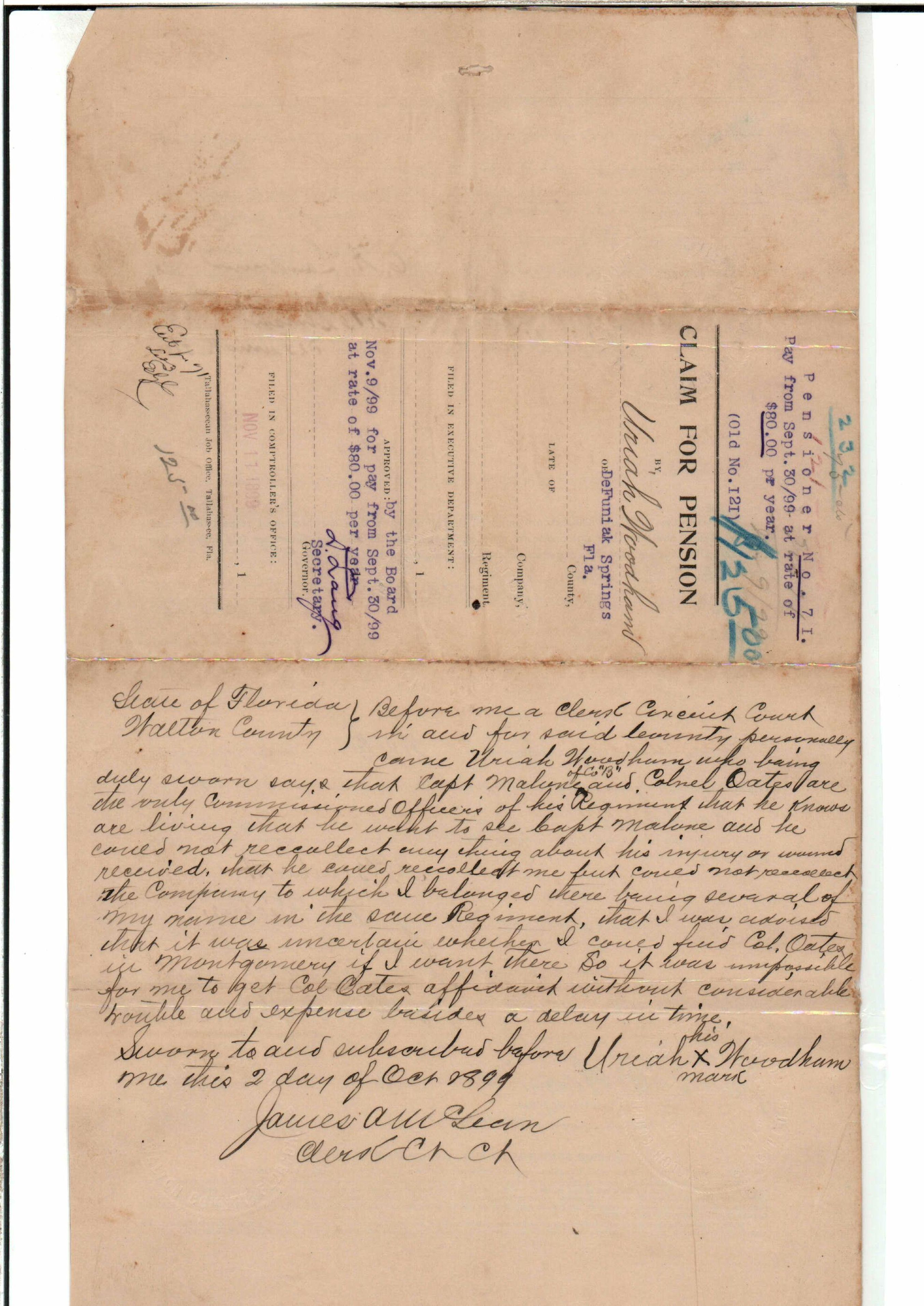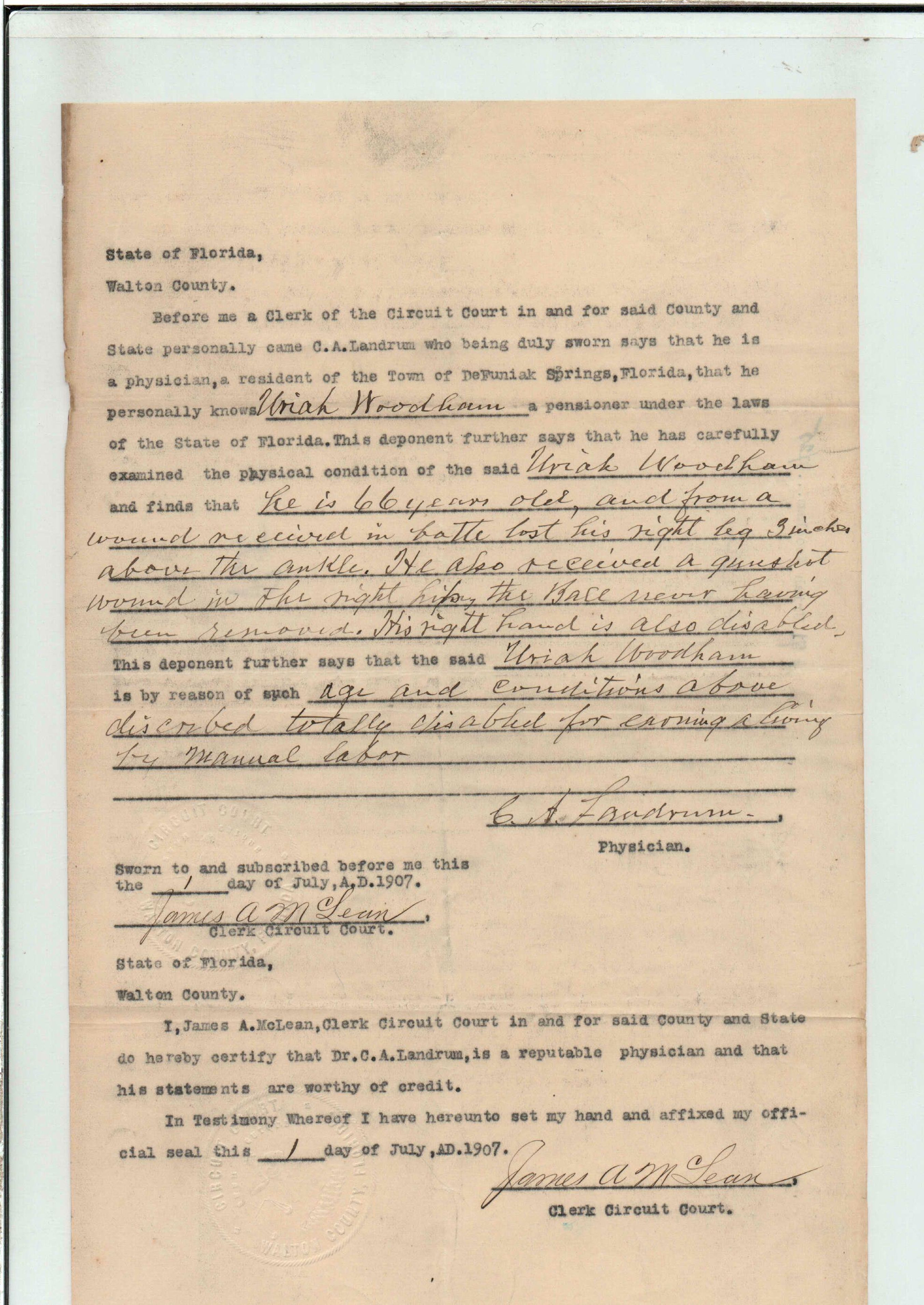 State Board of Pensions. WOODHAM, Uriah. 1888. State Archives of Florida, Florida Memory. <https://www.floridamemory.com/items/show/168292>, accessed 31 December 2025.