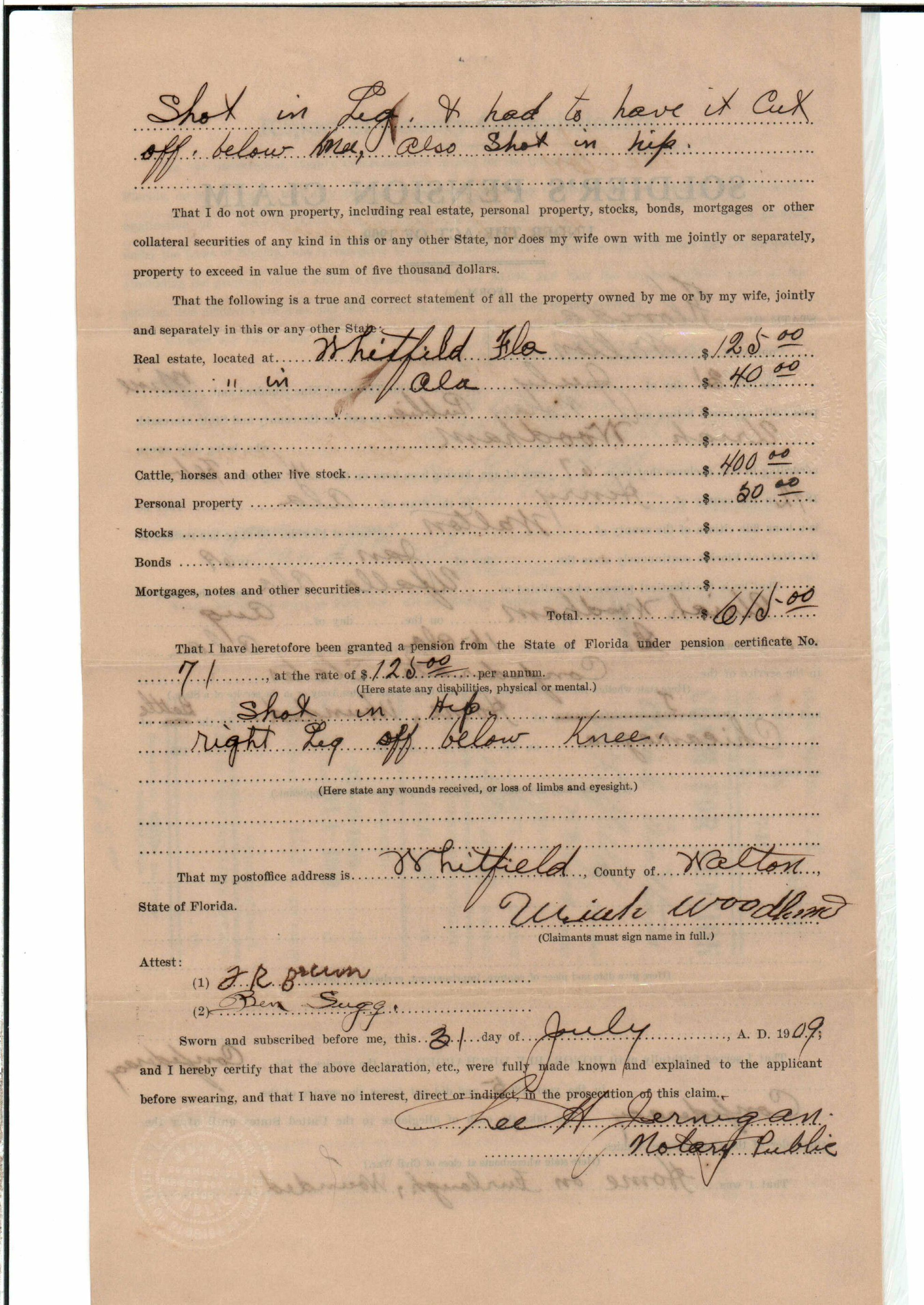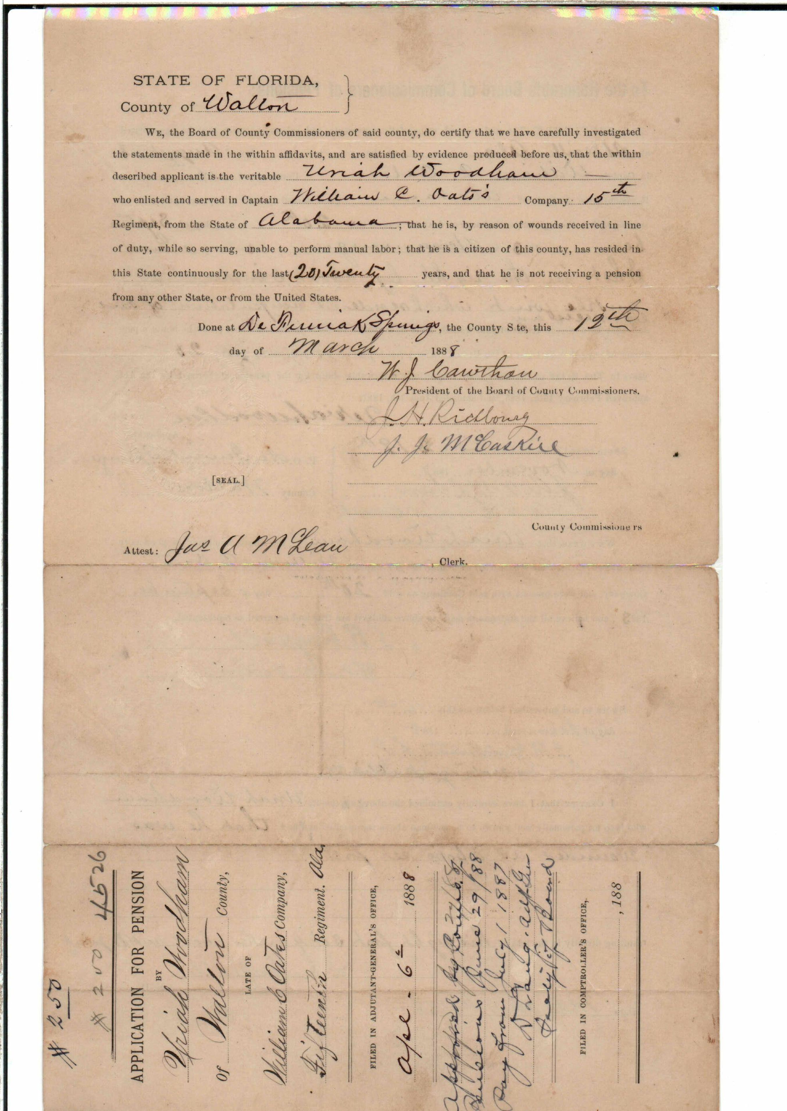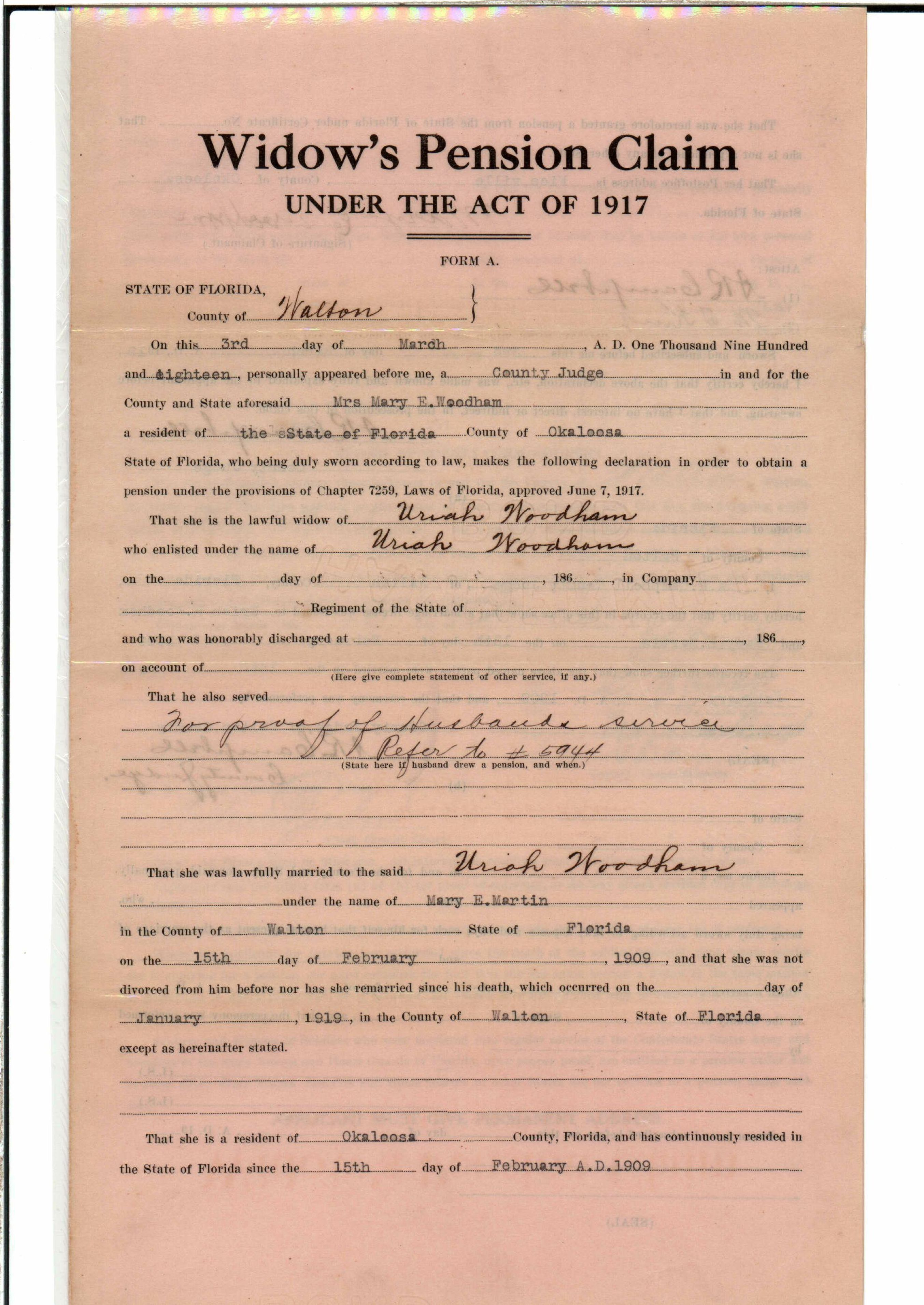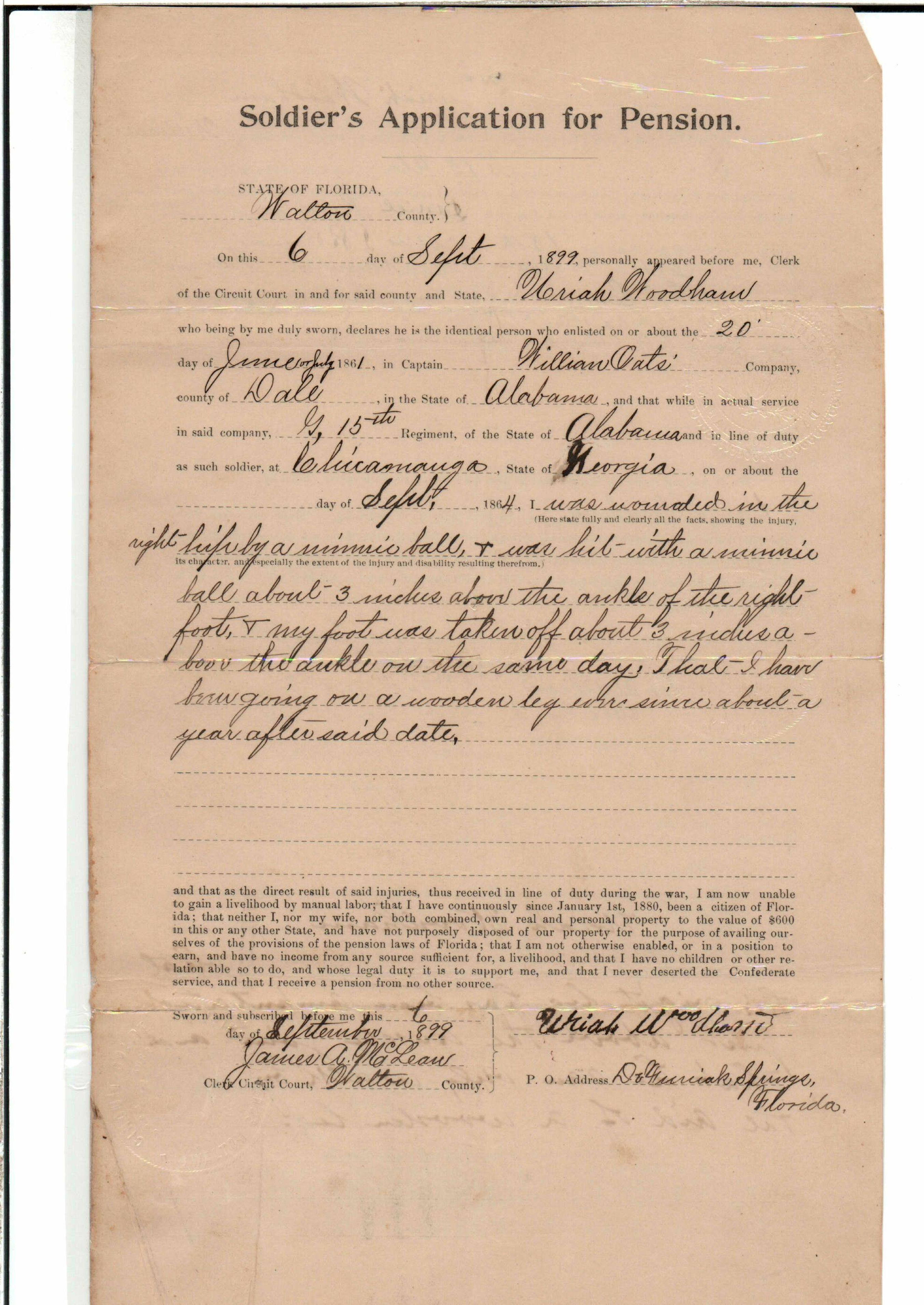 State Board of Pensions. WOODHAM, Uriah. 1888. State Archives of Florida, Florida Memory. <https://www.floridamemory.com/items/show/168292>, accessed 31 December 2025.
