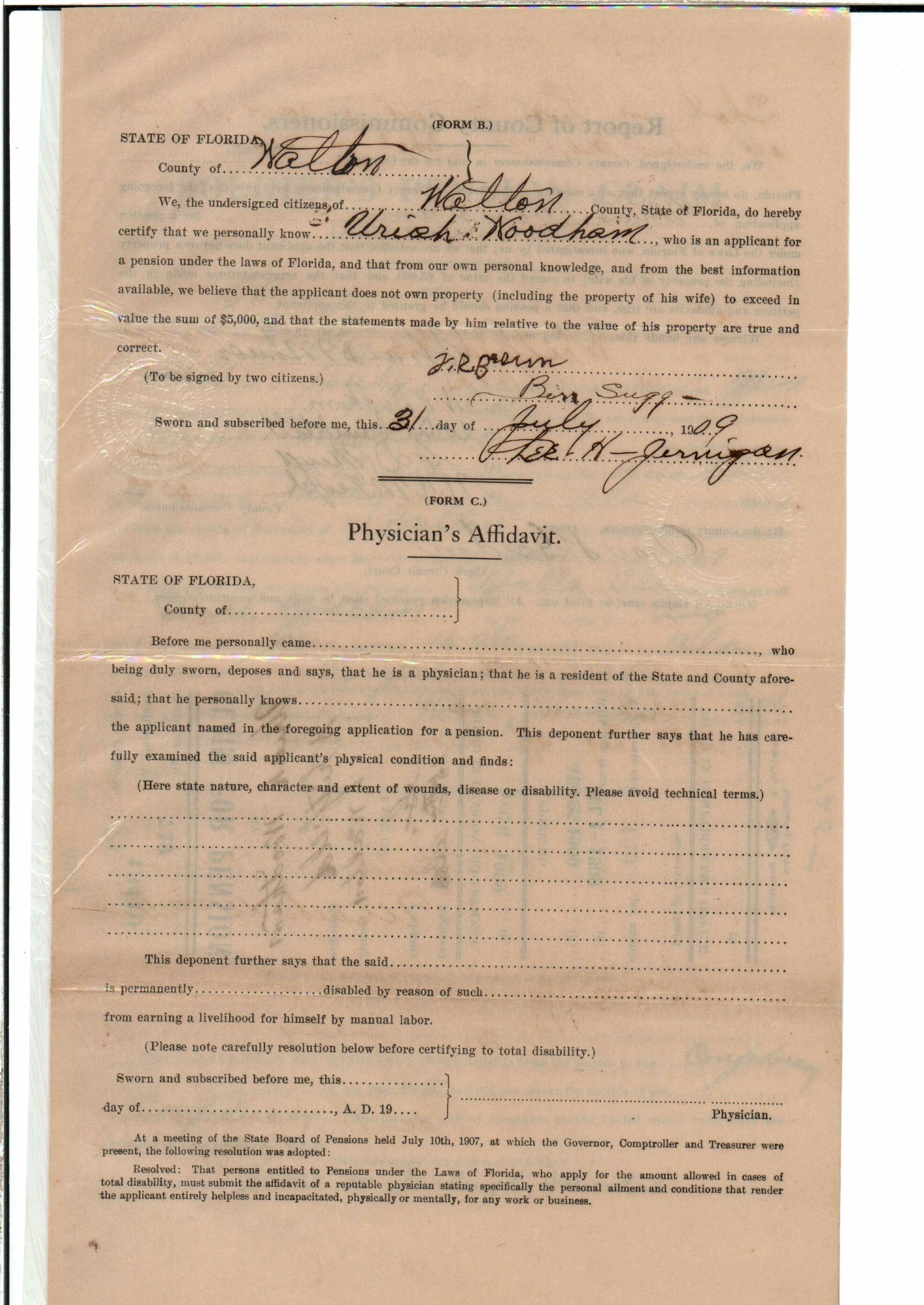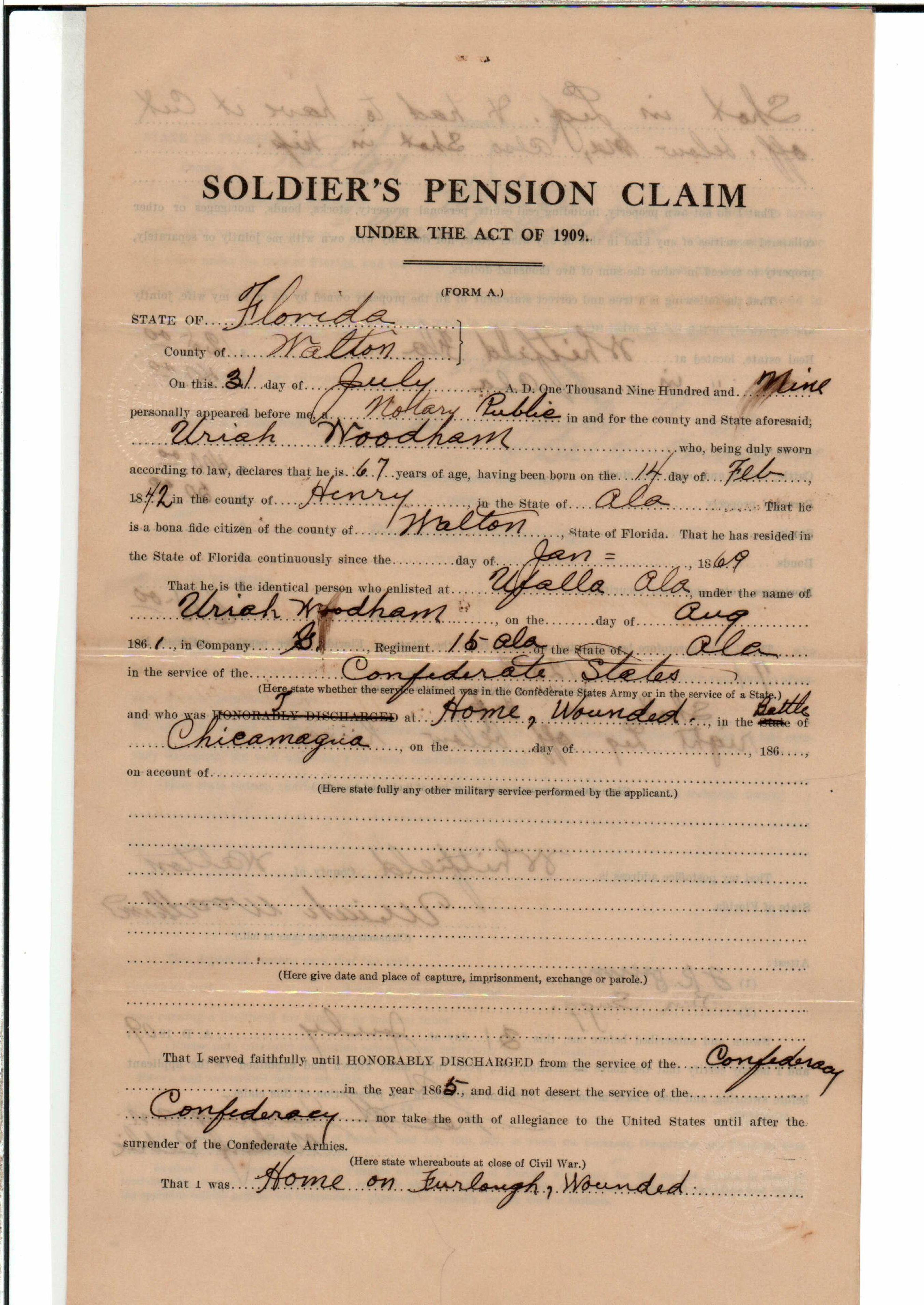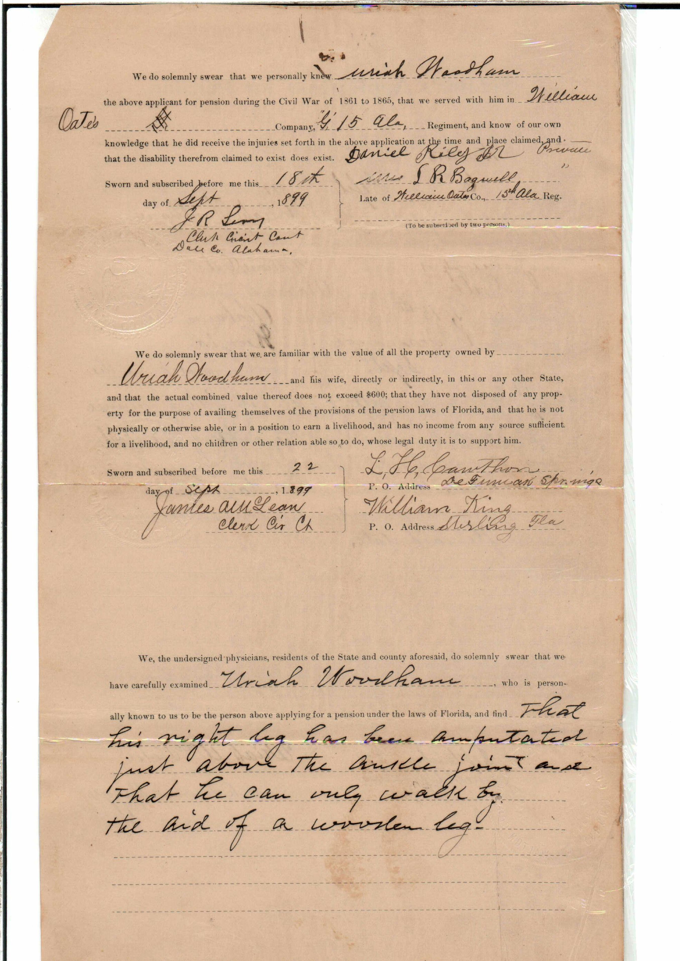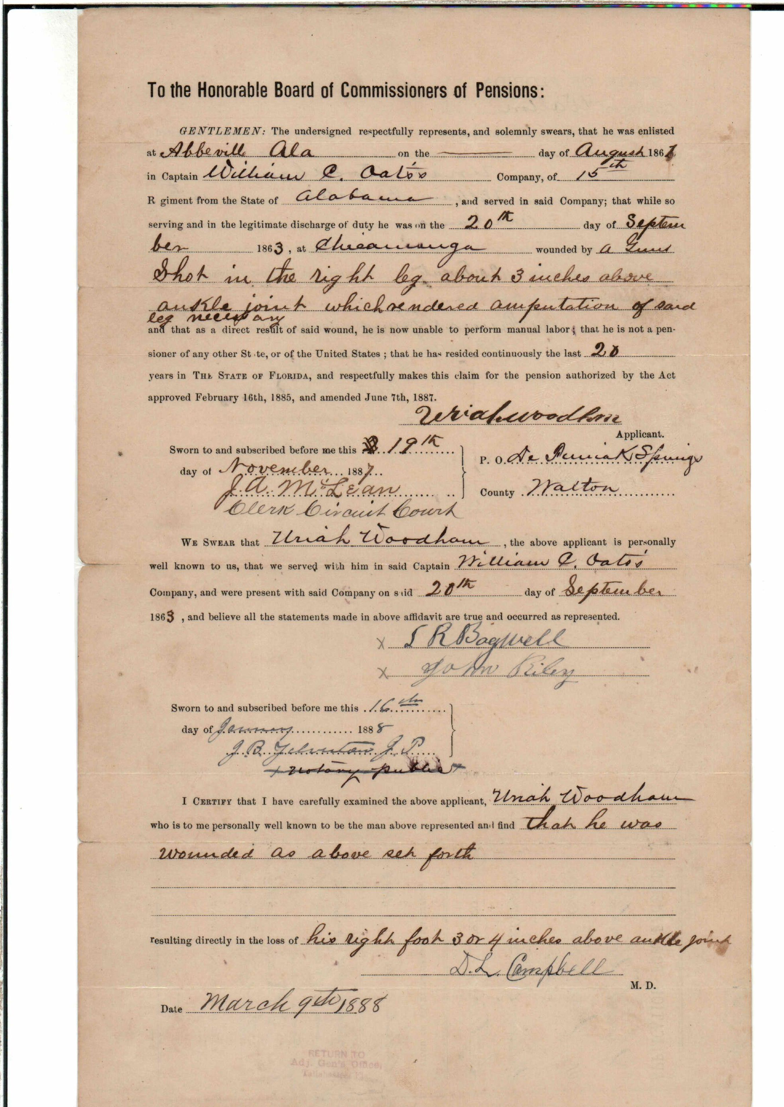 State Board of Pensions. WOODHAM, Uriah. 1888. State Archives of Florida, Florida Memory. Accessed 31 Dec. 2025.<https://www.floridamemory.com/items/show/168292>