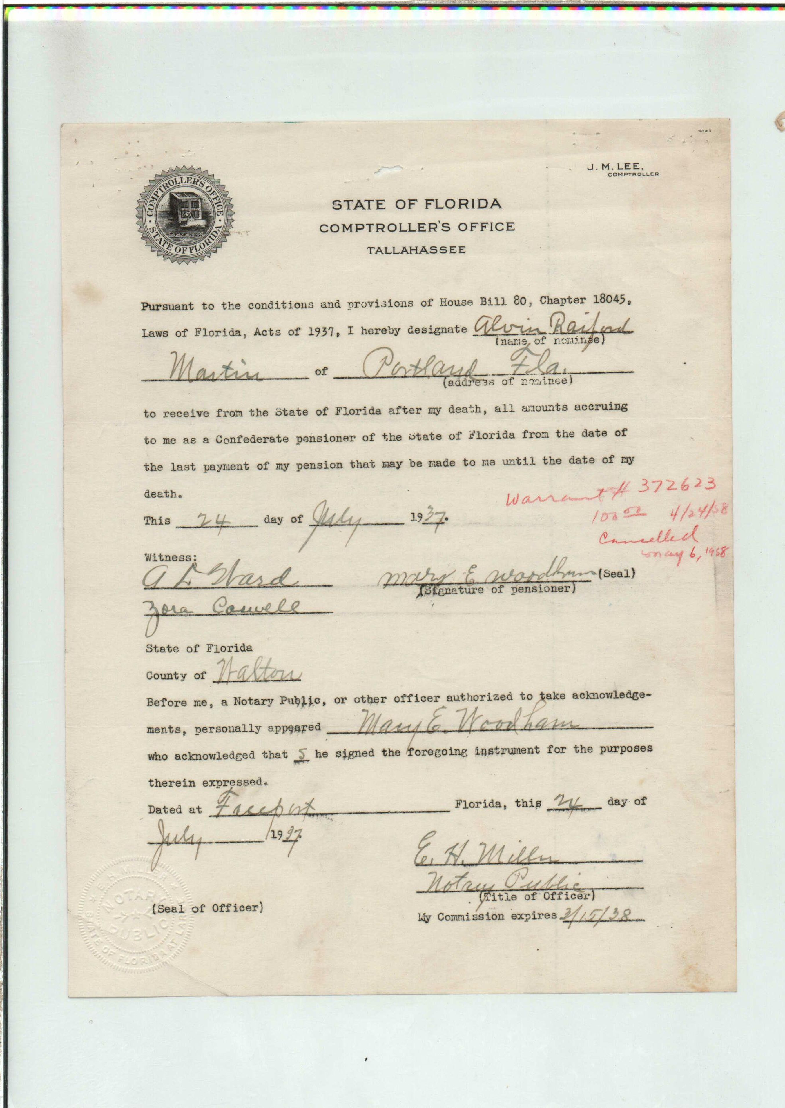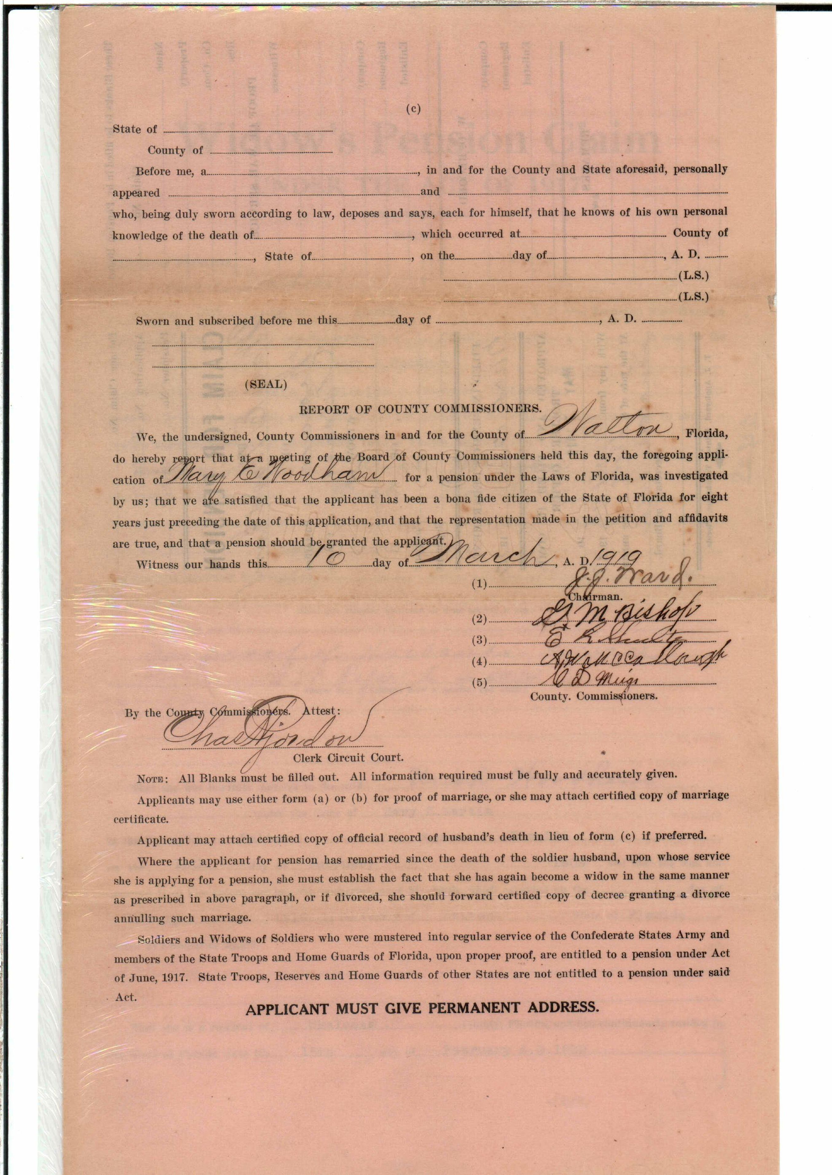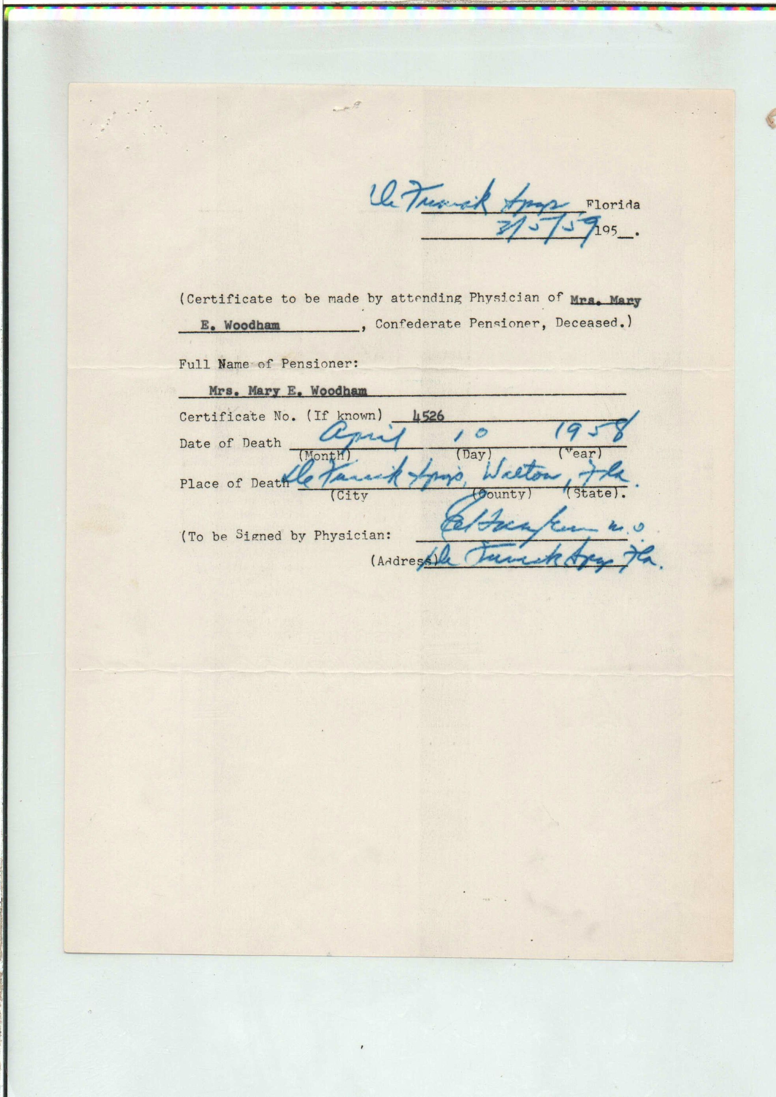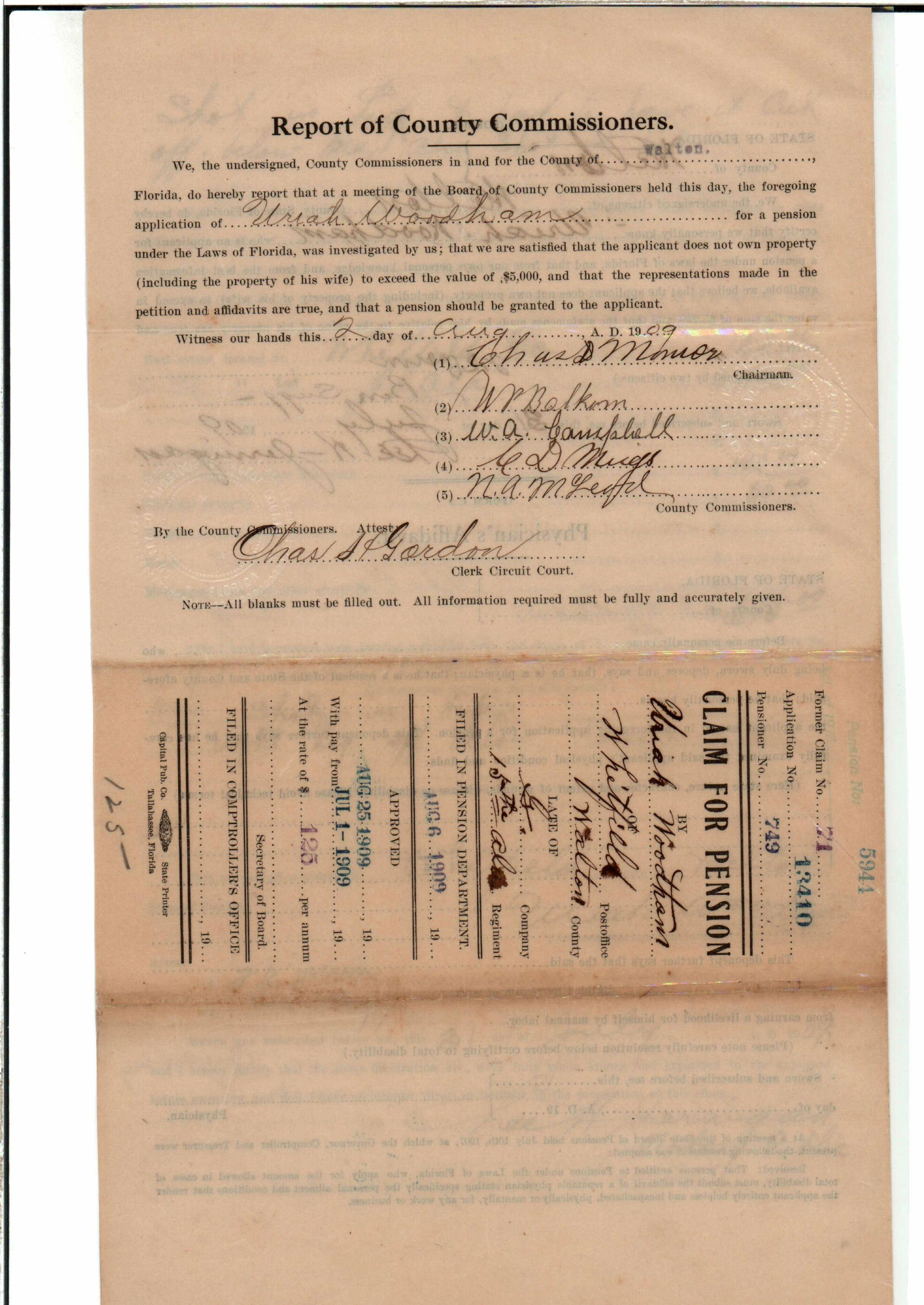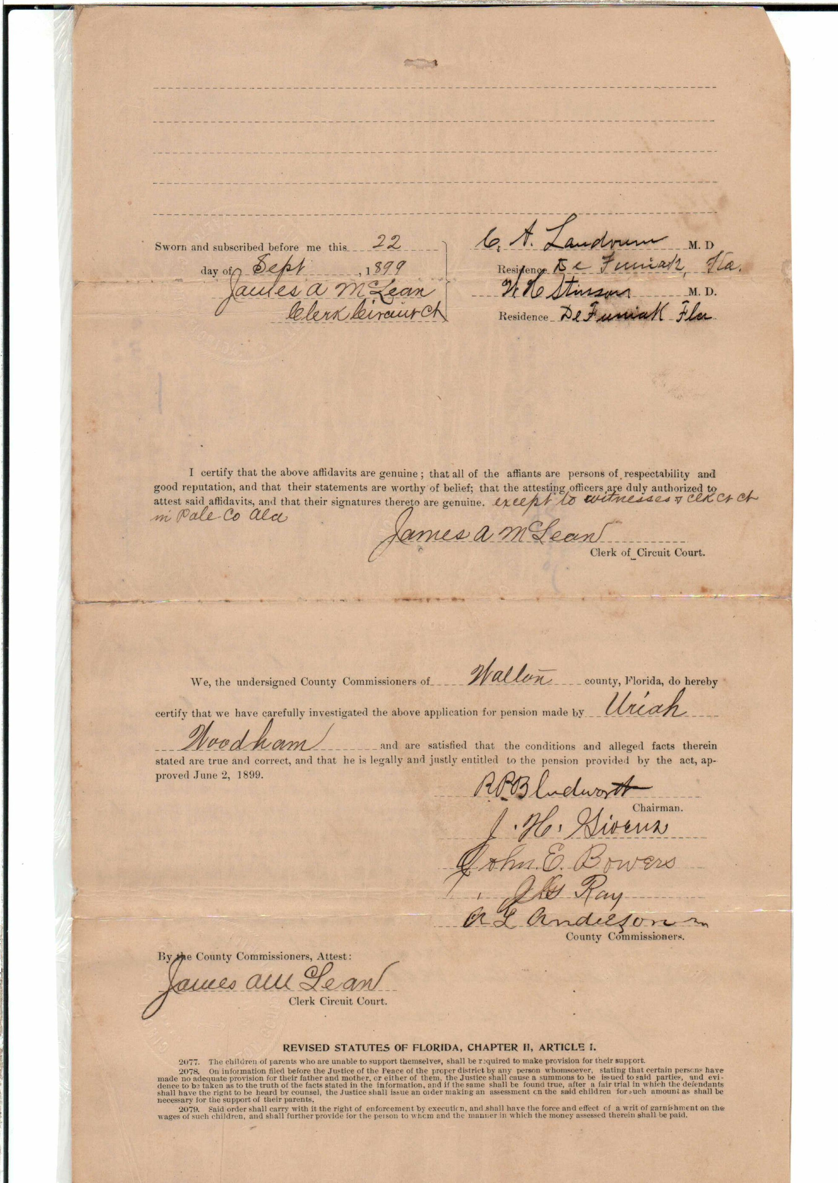 State Board of Pensions. WOODHAM, Uriah. 1888. State Archives of Florida, Florida Memory. Accessed 31 Dec. 2025.<https://www.floridamemory.com/items/show/168292>