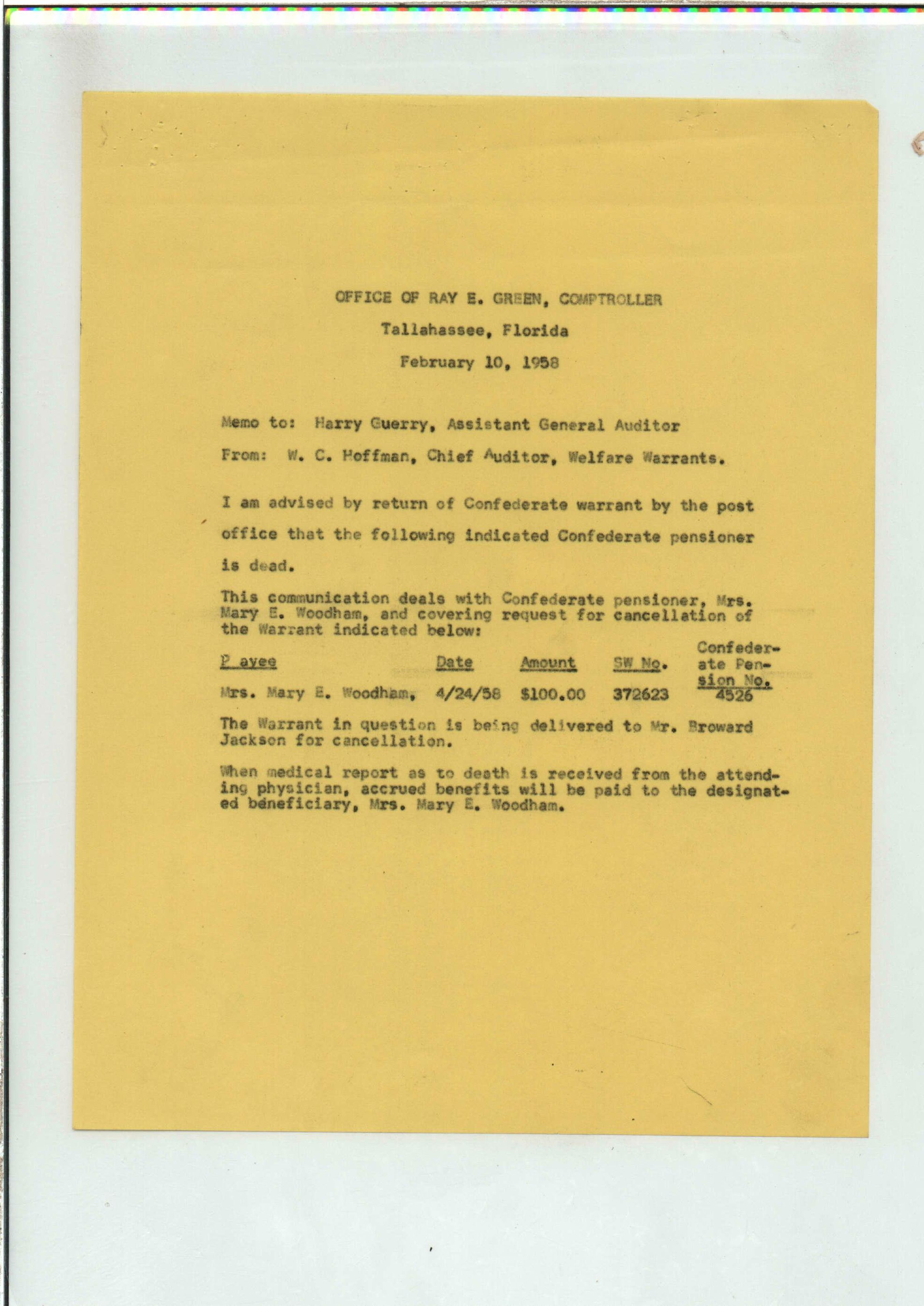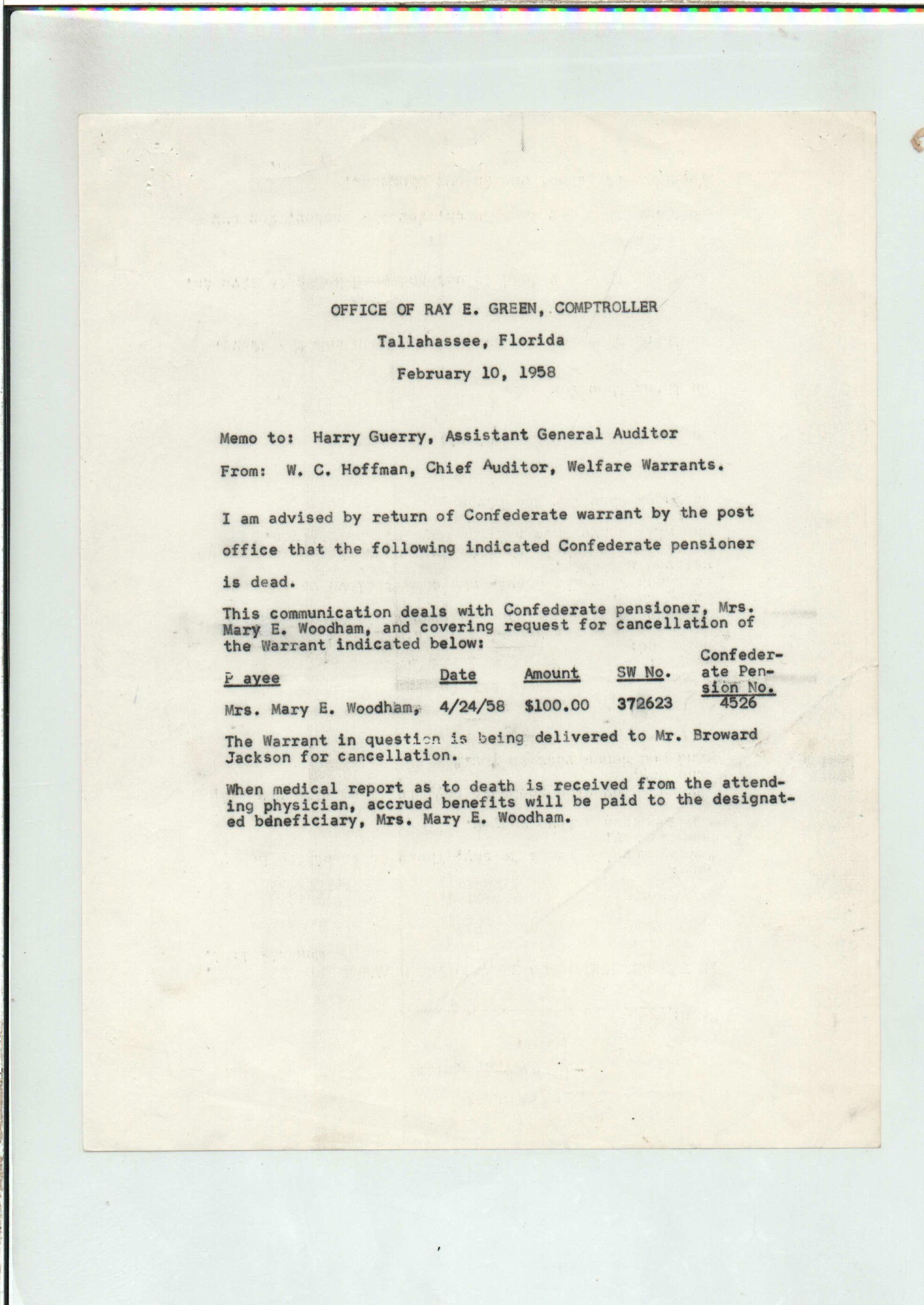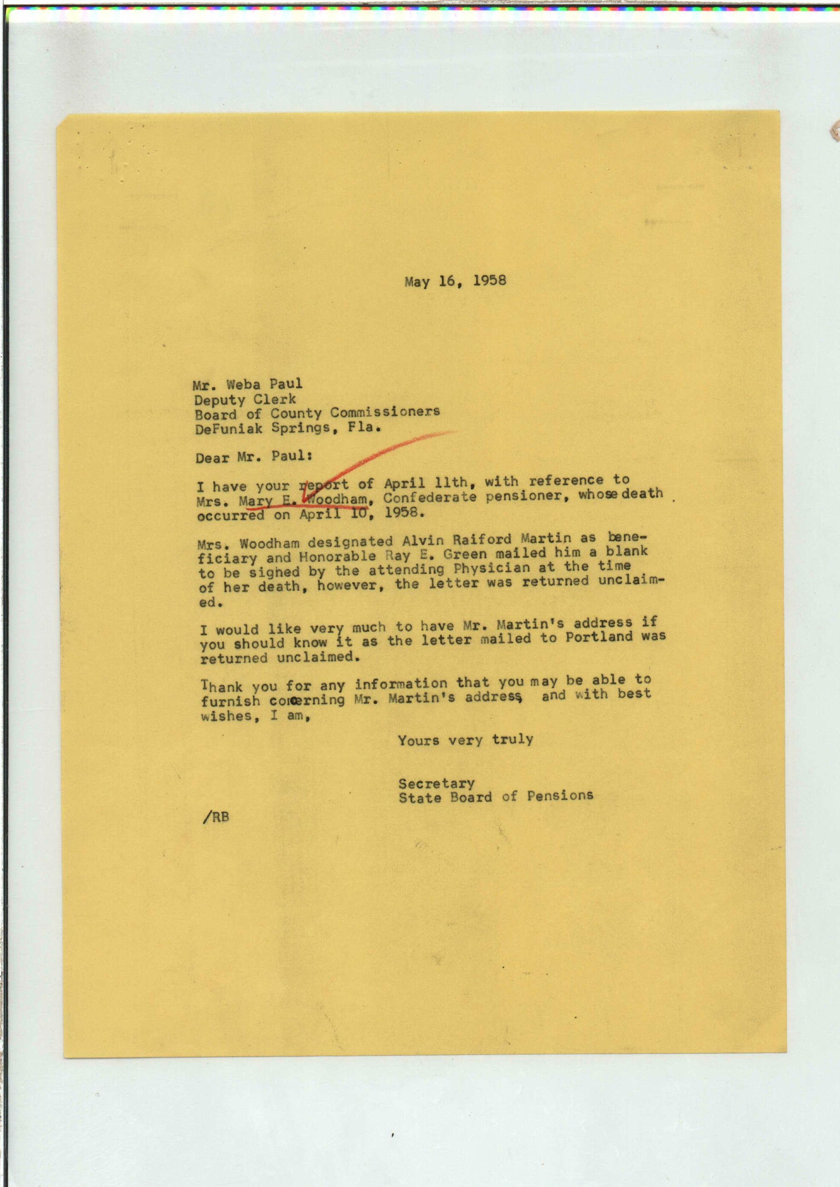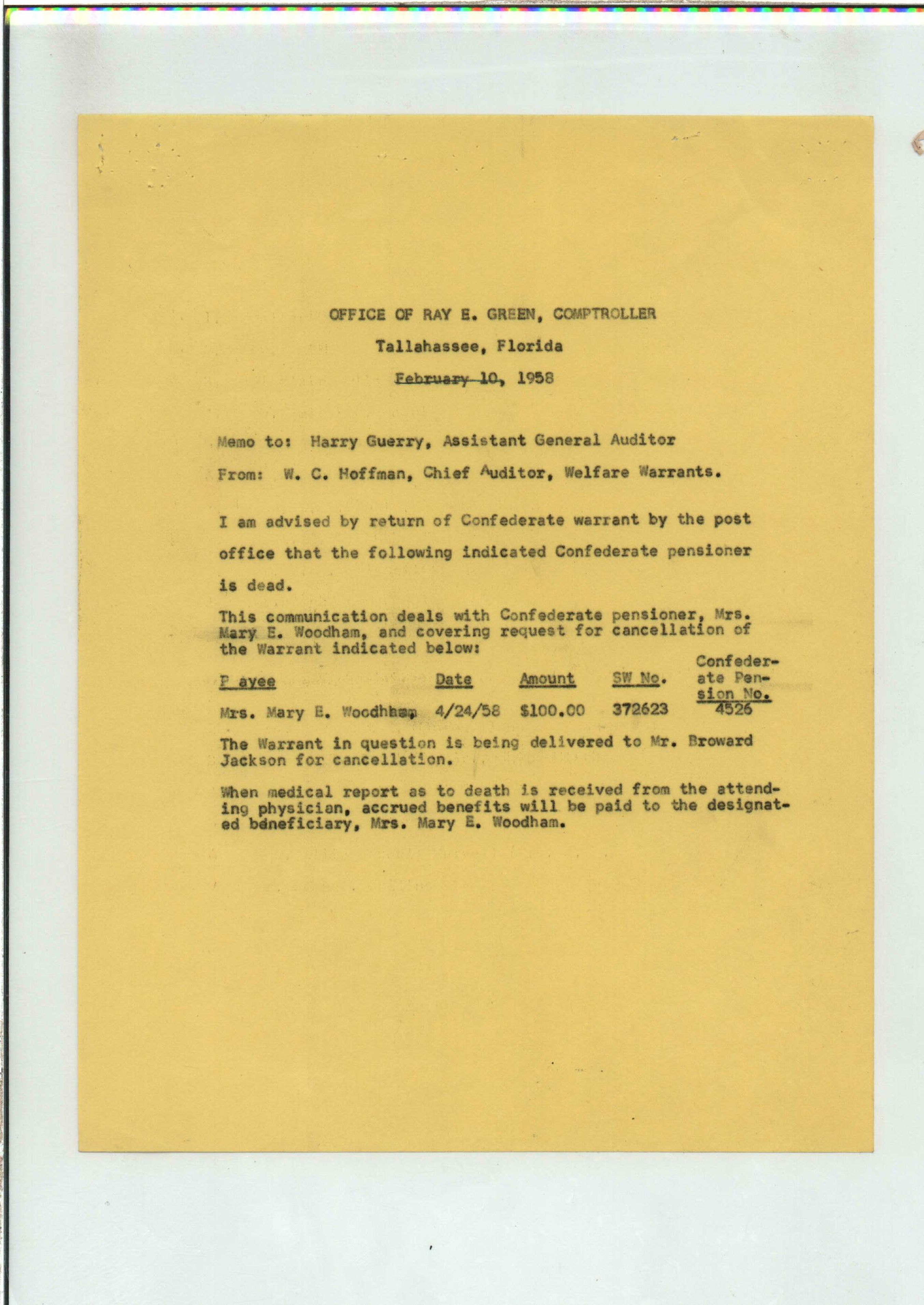 State Board of Pensions. WOODHAM, Uriah. 1888. State Archives of Florida, Florida Memory. Accessed 31 Dec. 2025.<https://www.floridamemory.com/items/show/168292>