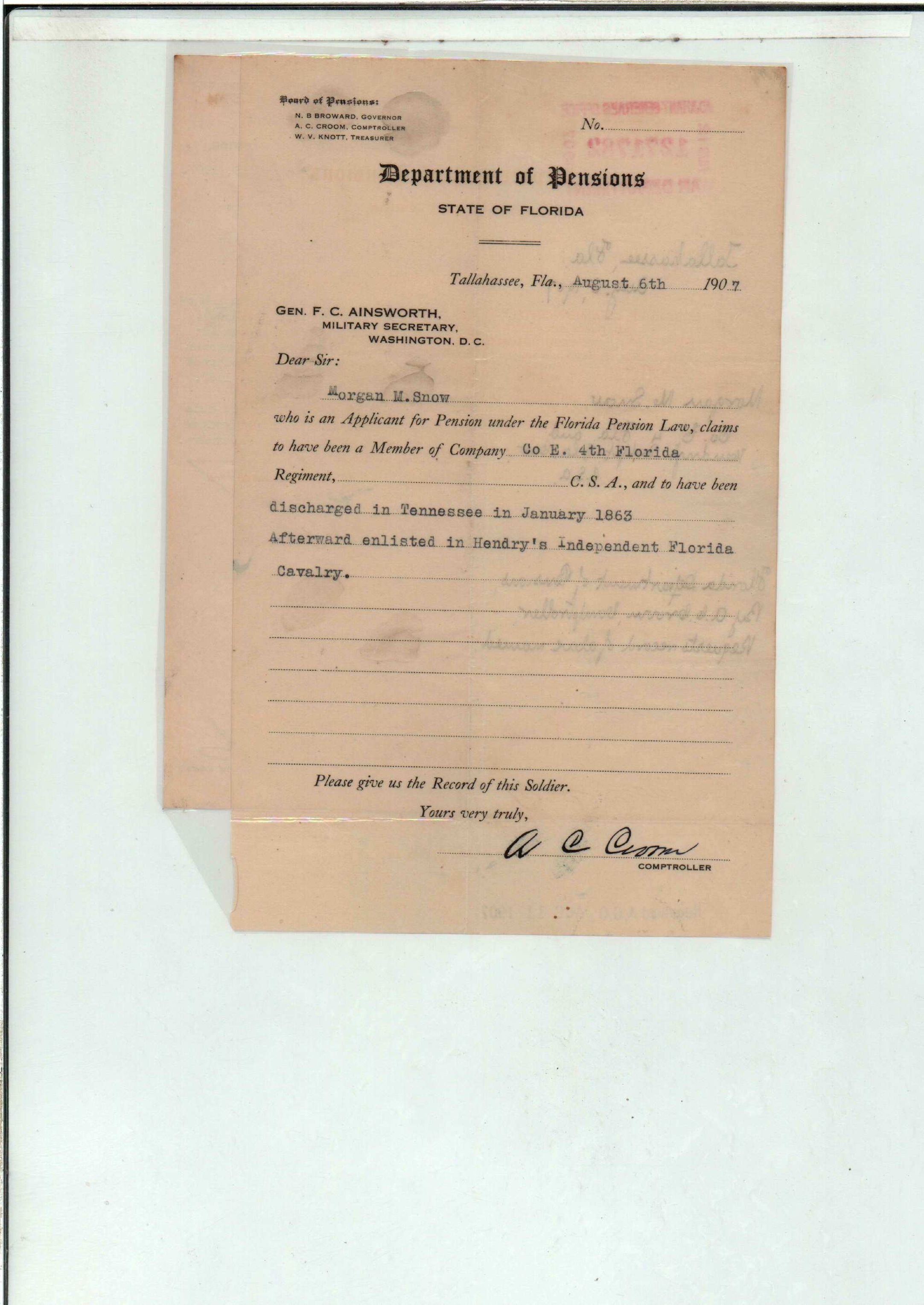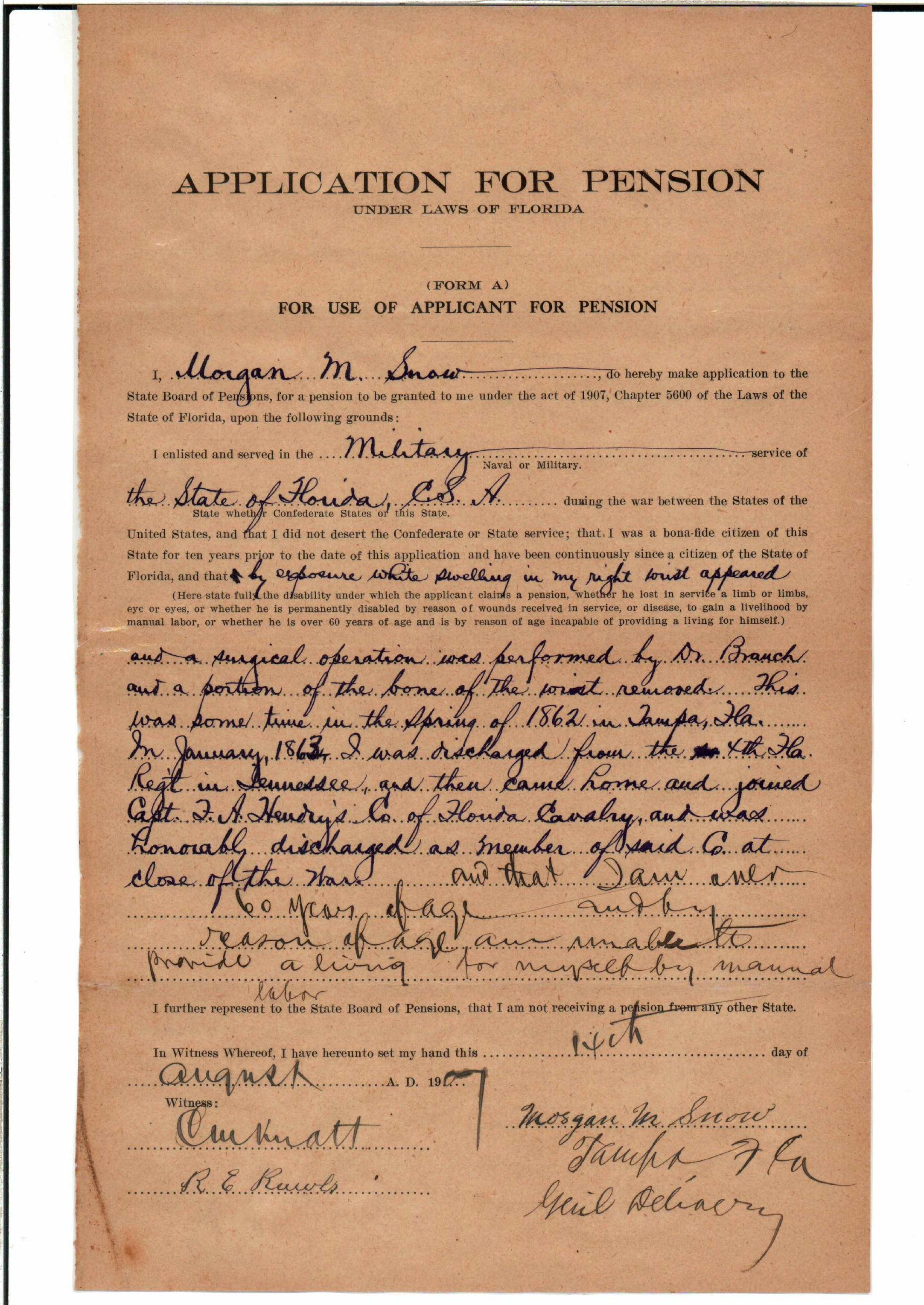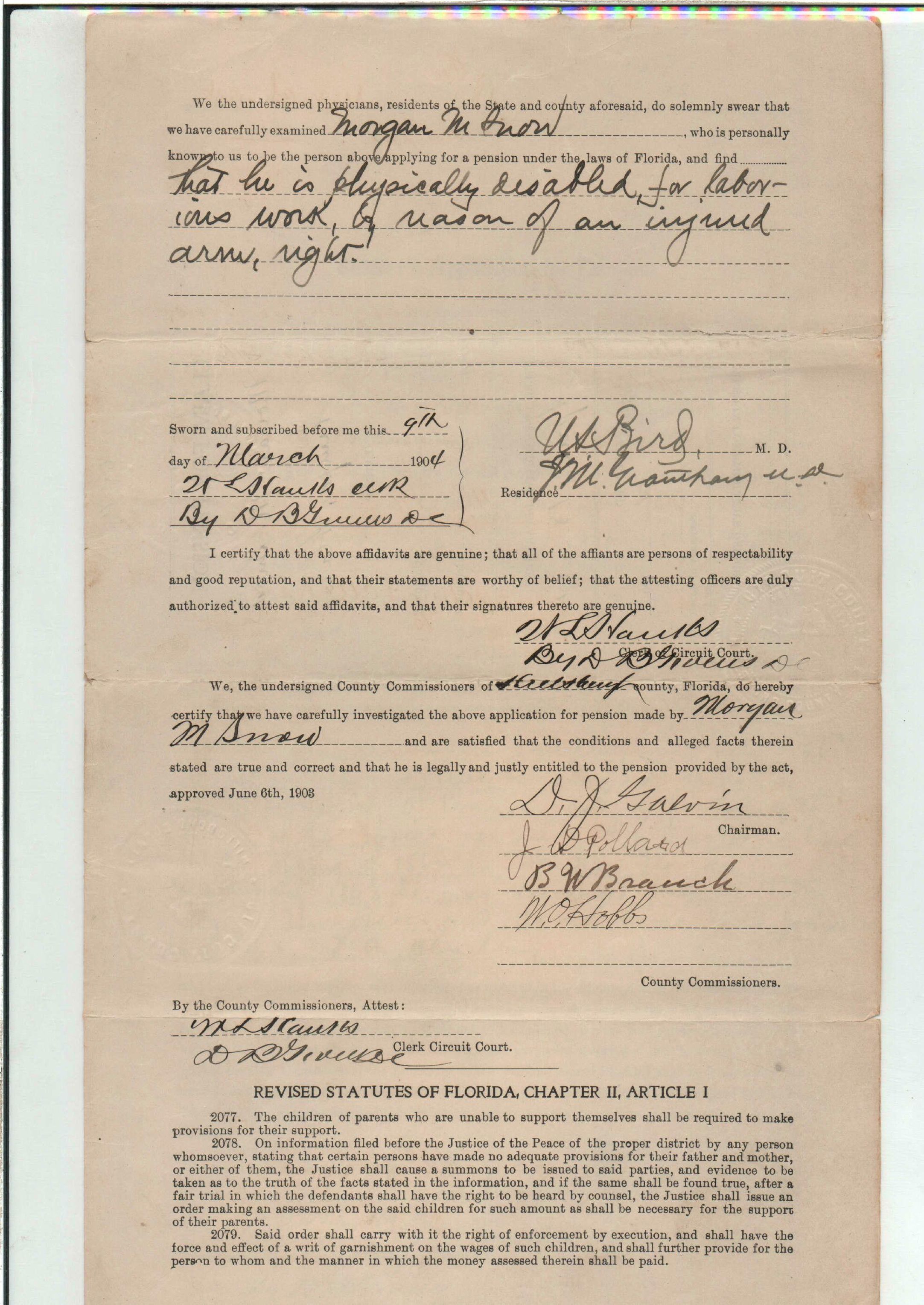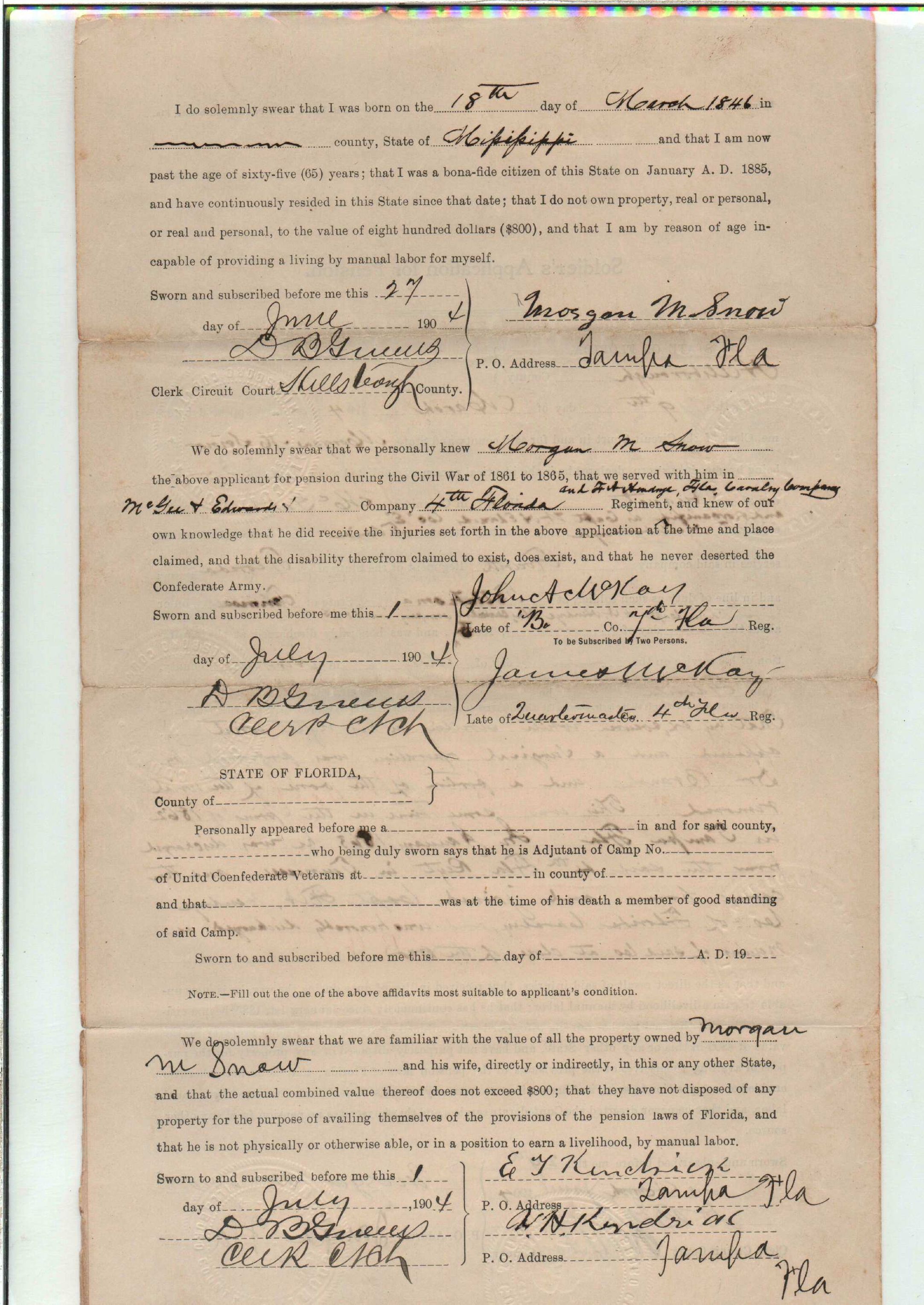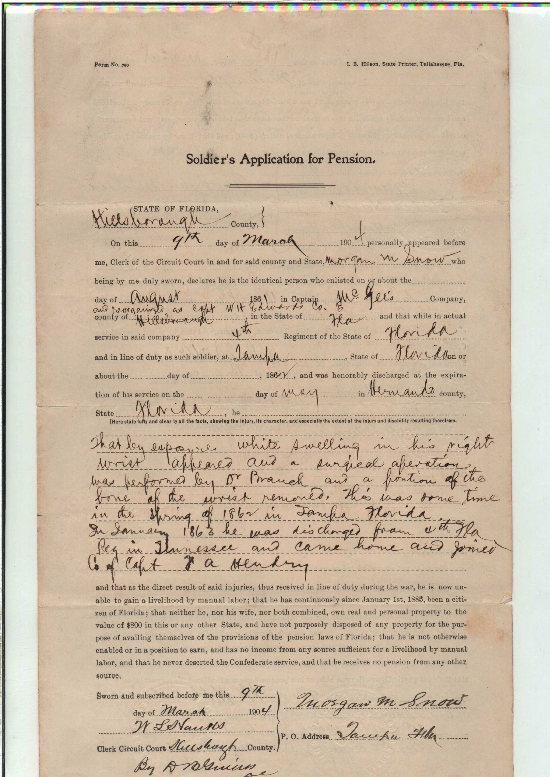 State Board of Pensions. SNOW, Morgan M. 1904. State Archives of Florida, Florida Memory. <https://www.floridamemory.com/items/show/177809>, accessed 1 January 2026.