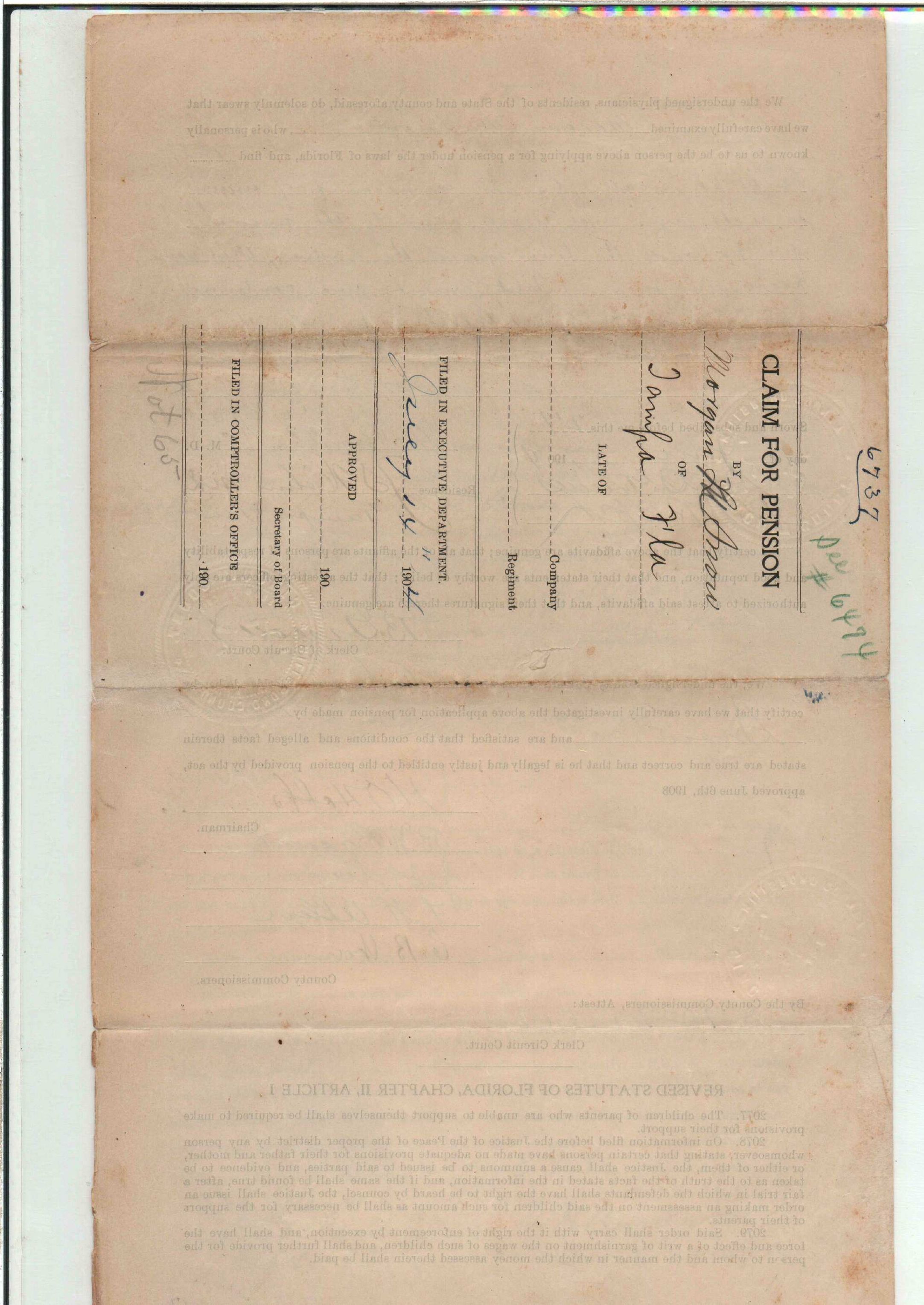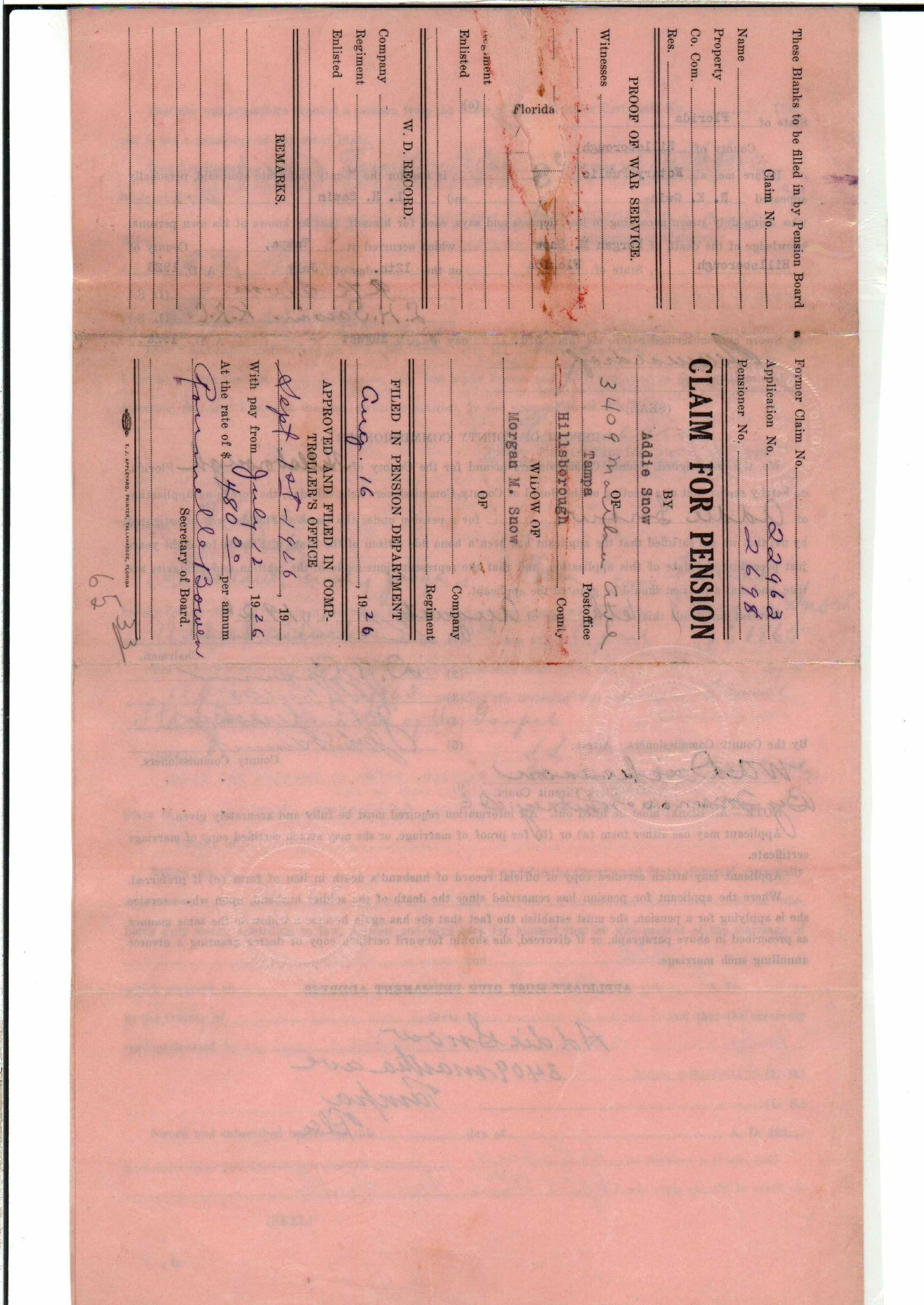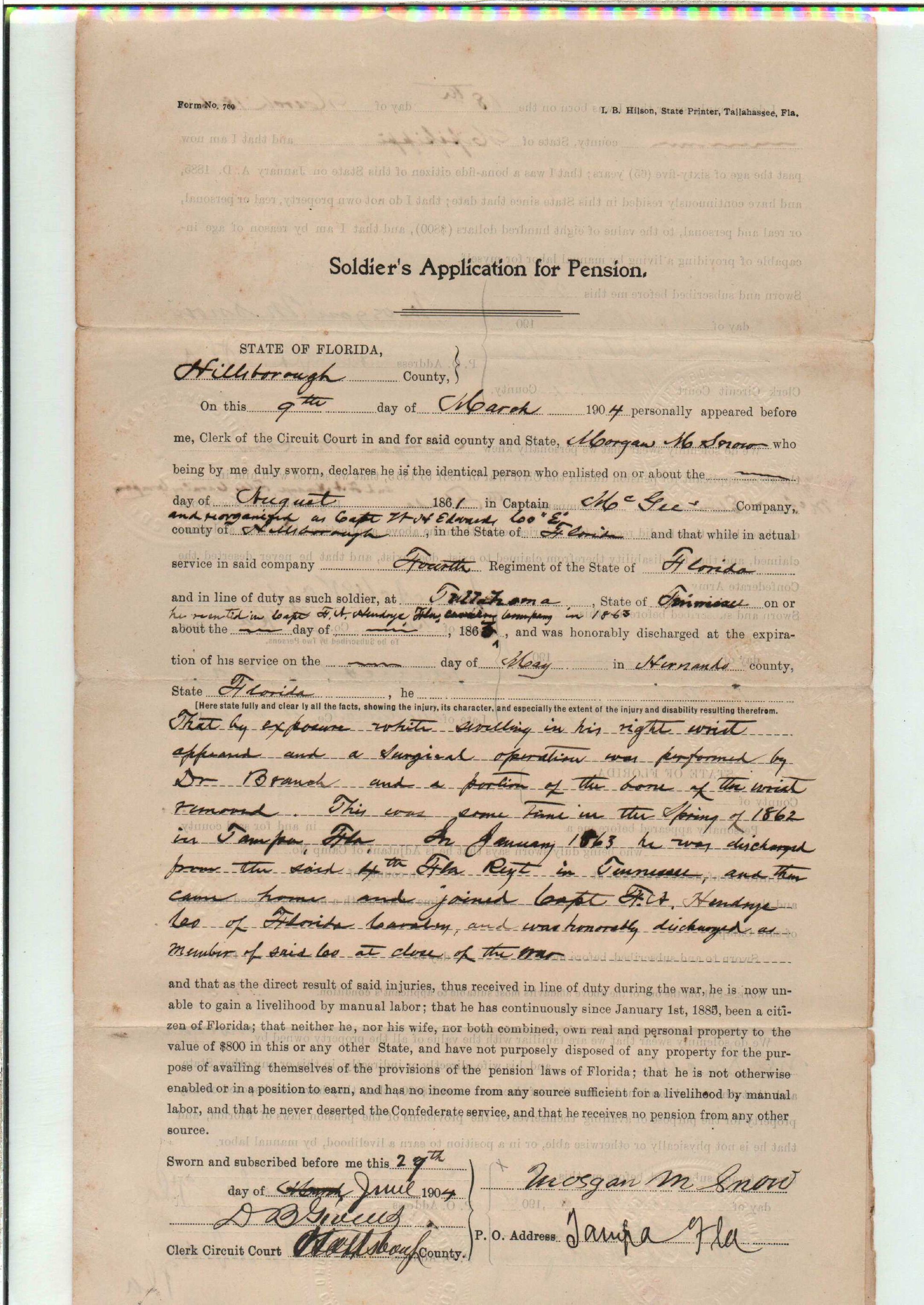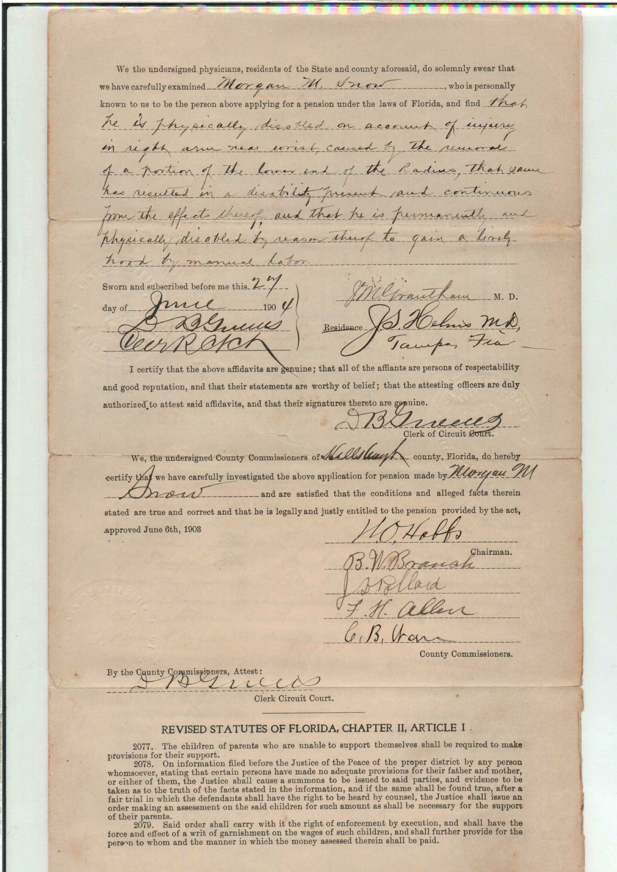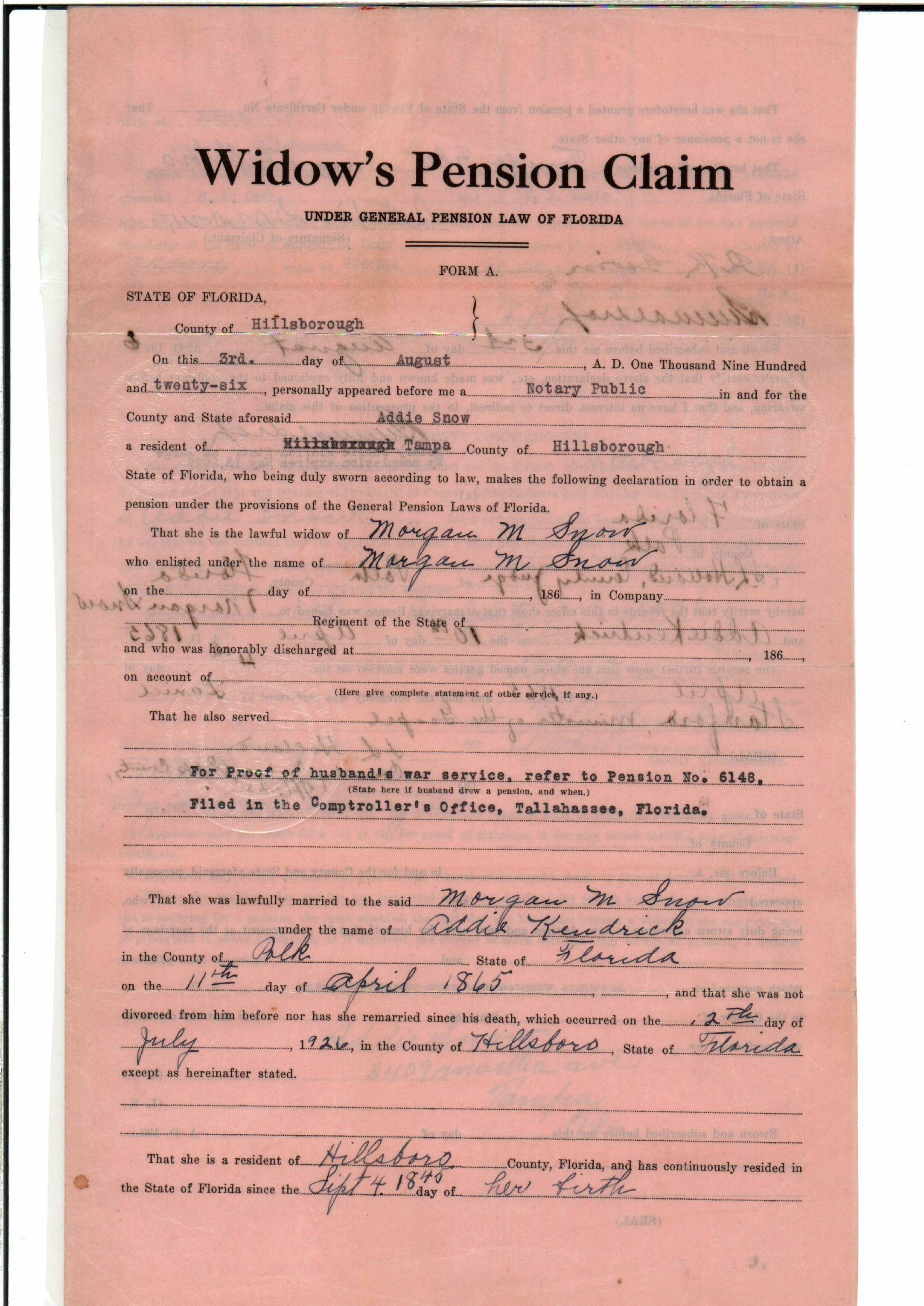 State Board of Pensions. SNOW, Morgan M. 1904. State Archives of Florida, Florida Memory. <https://www.floridamemory.com/items/show/177809>, accessed 1 January 2026.