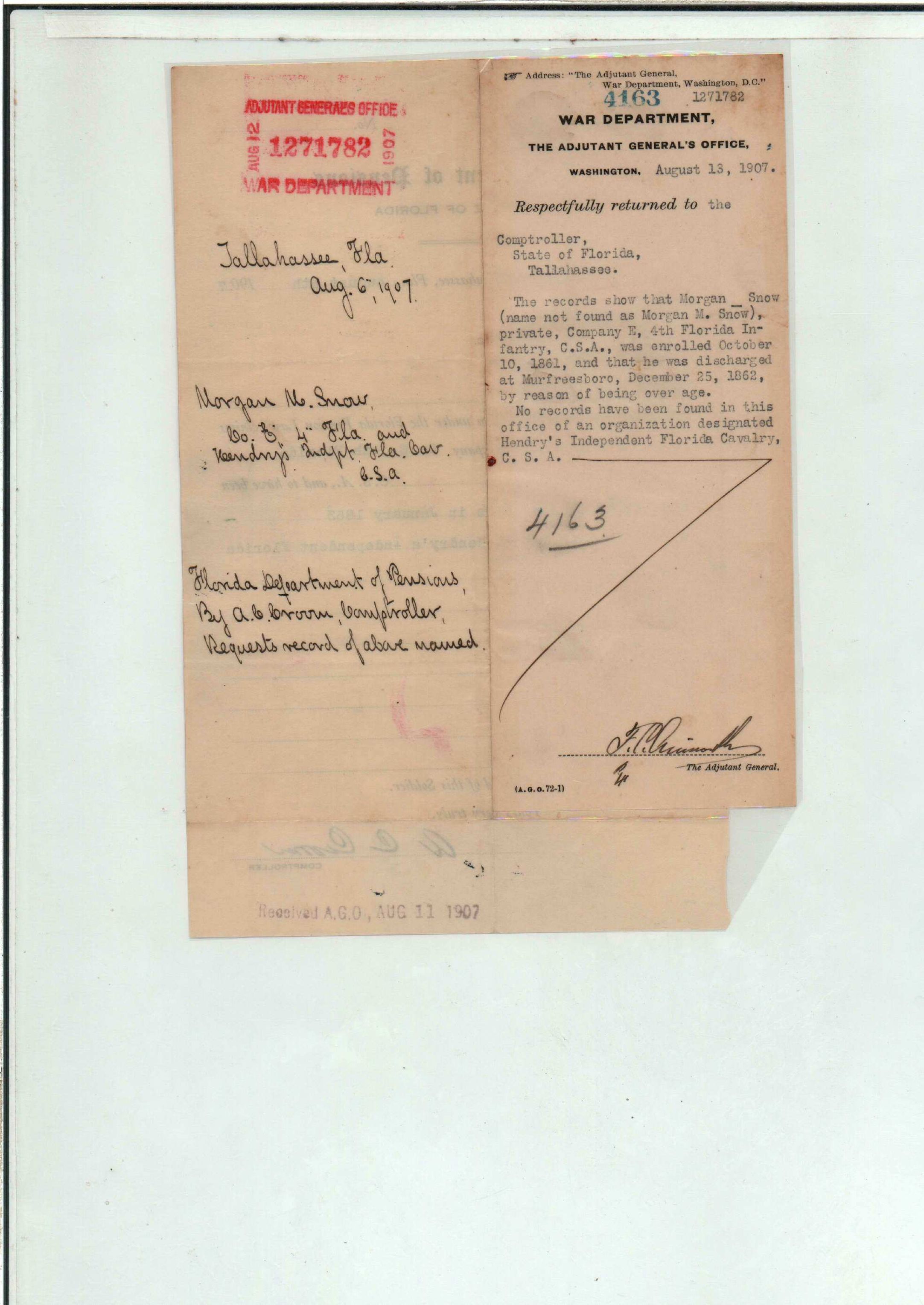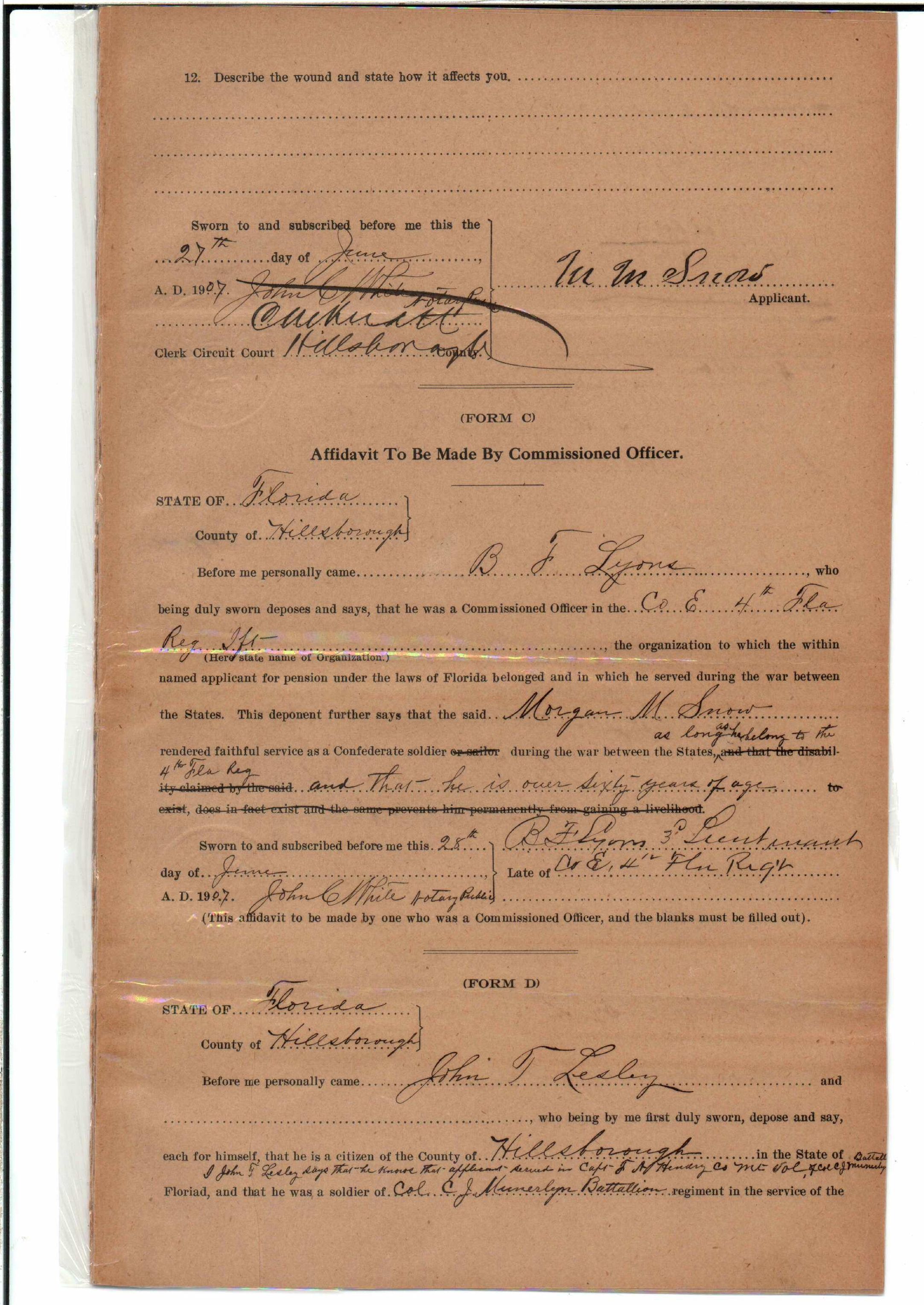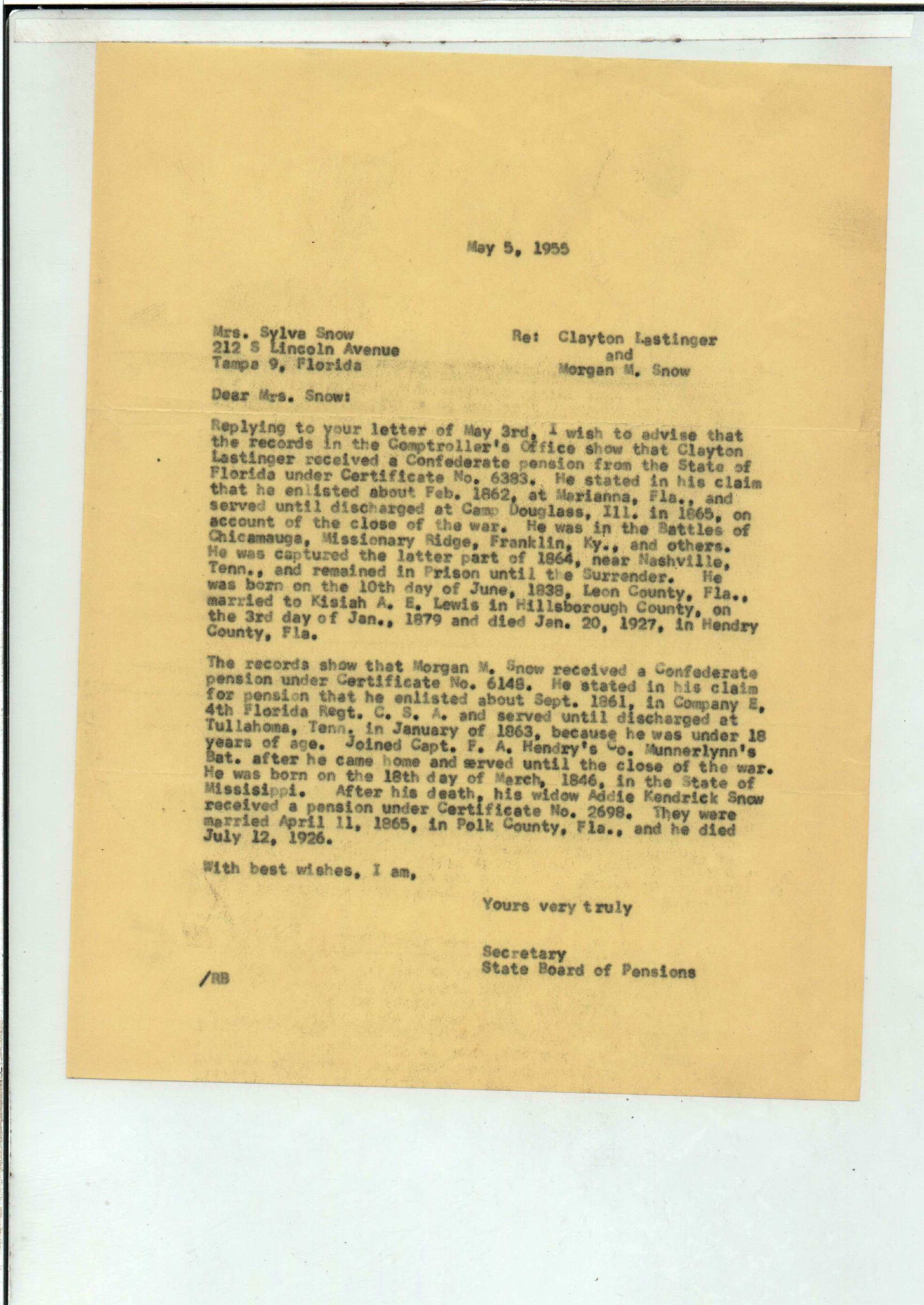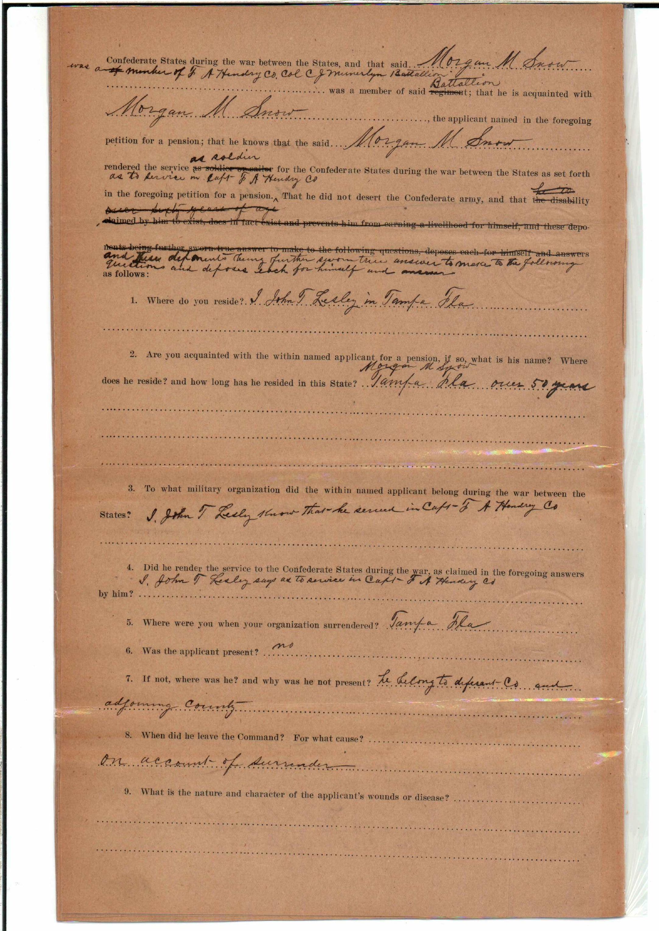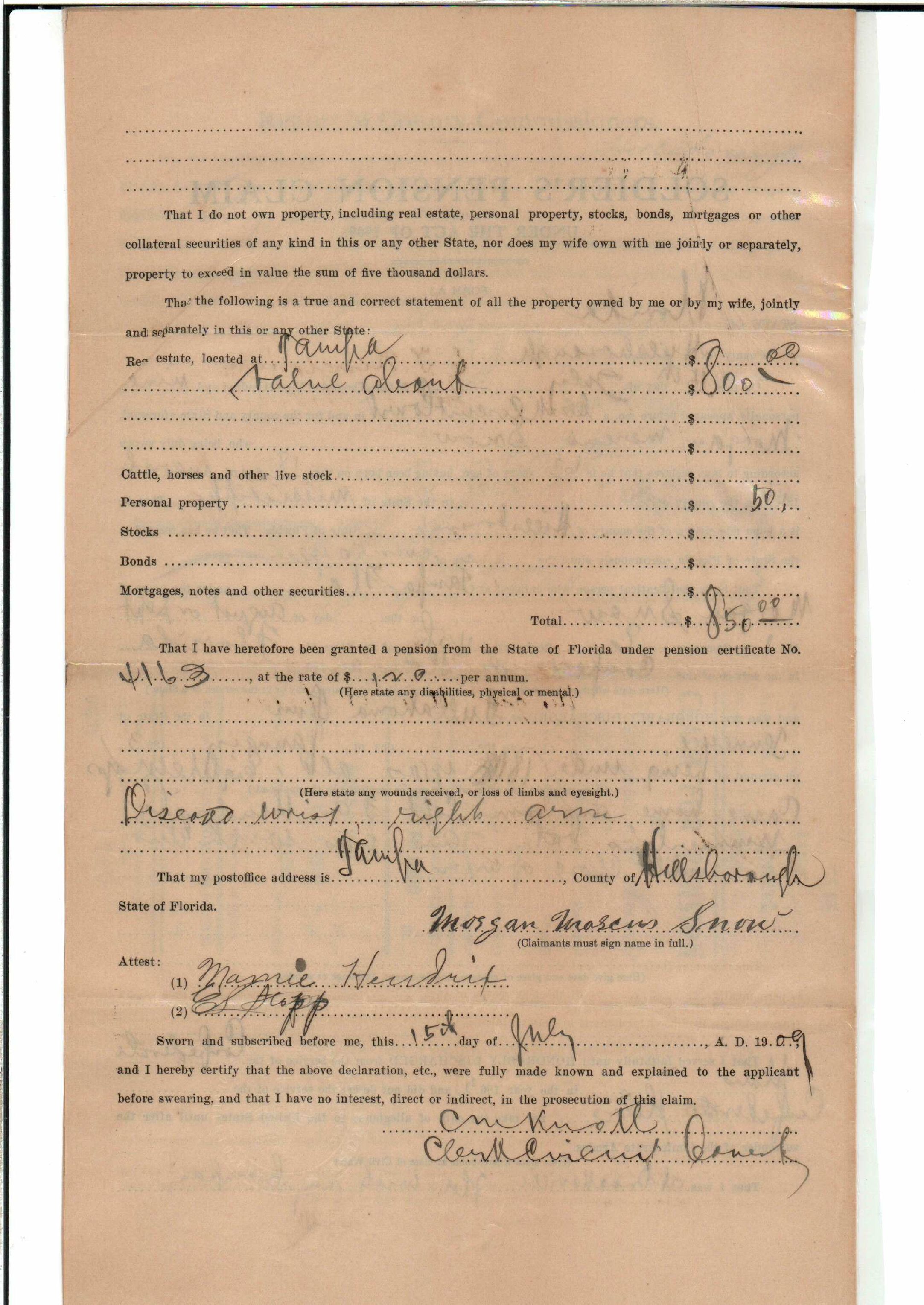 State Board of Pensions. SNOW, Morgan M. 1904. State Archives of Florida, Florida Memory. <https://www.floridamemory.com/items/show/177809>, accessed 1 January 2026.