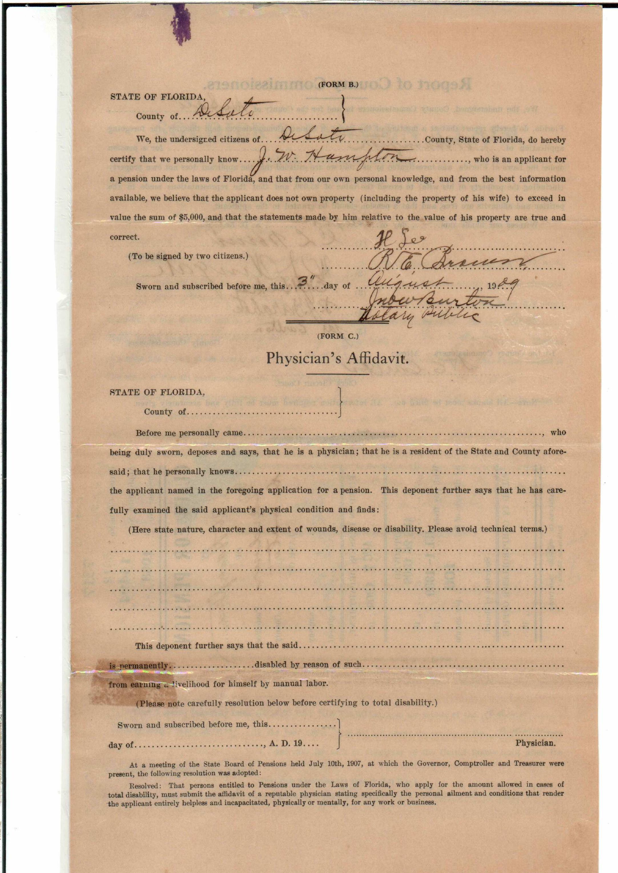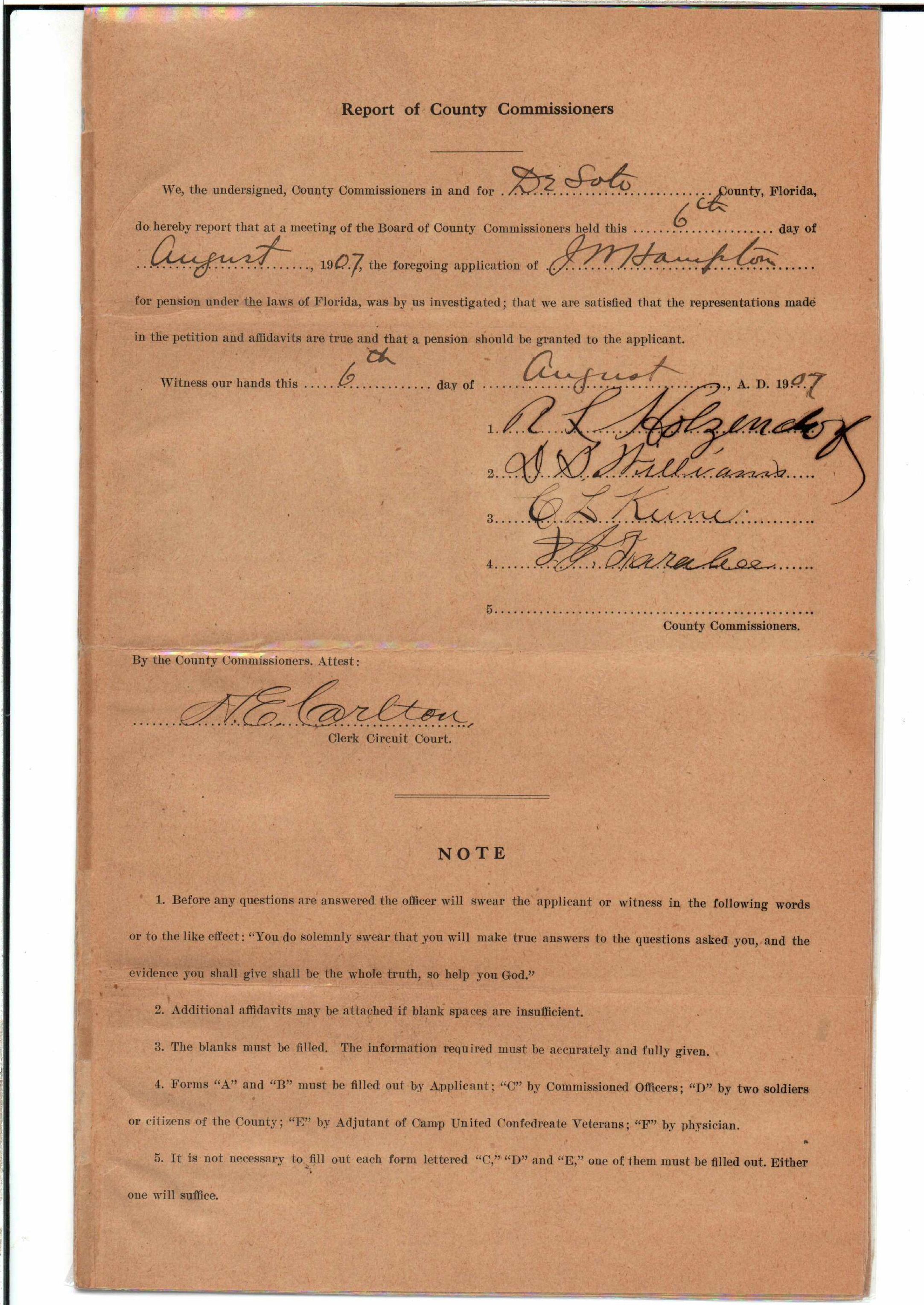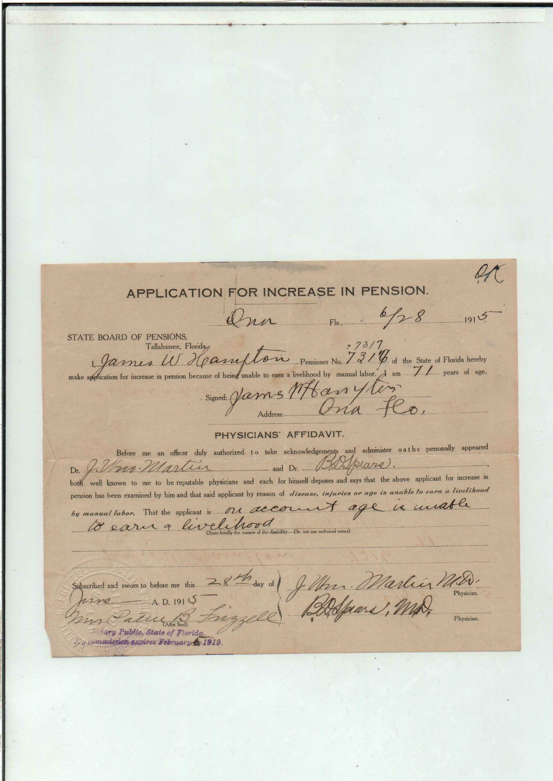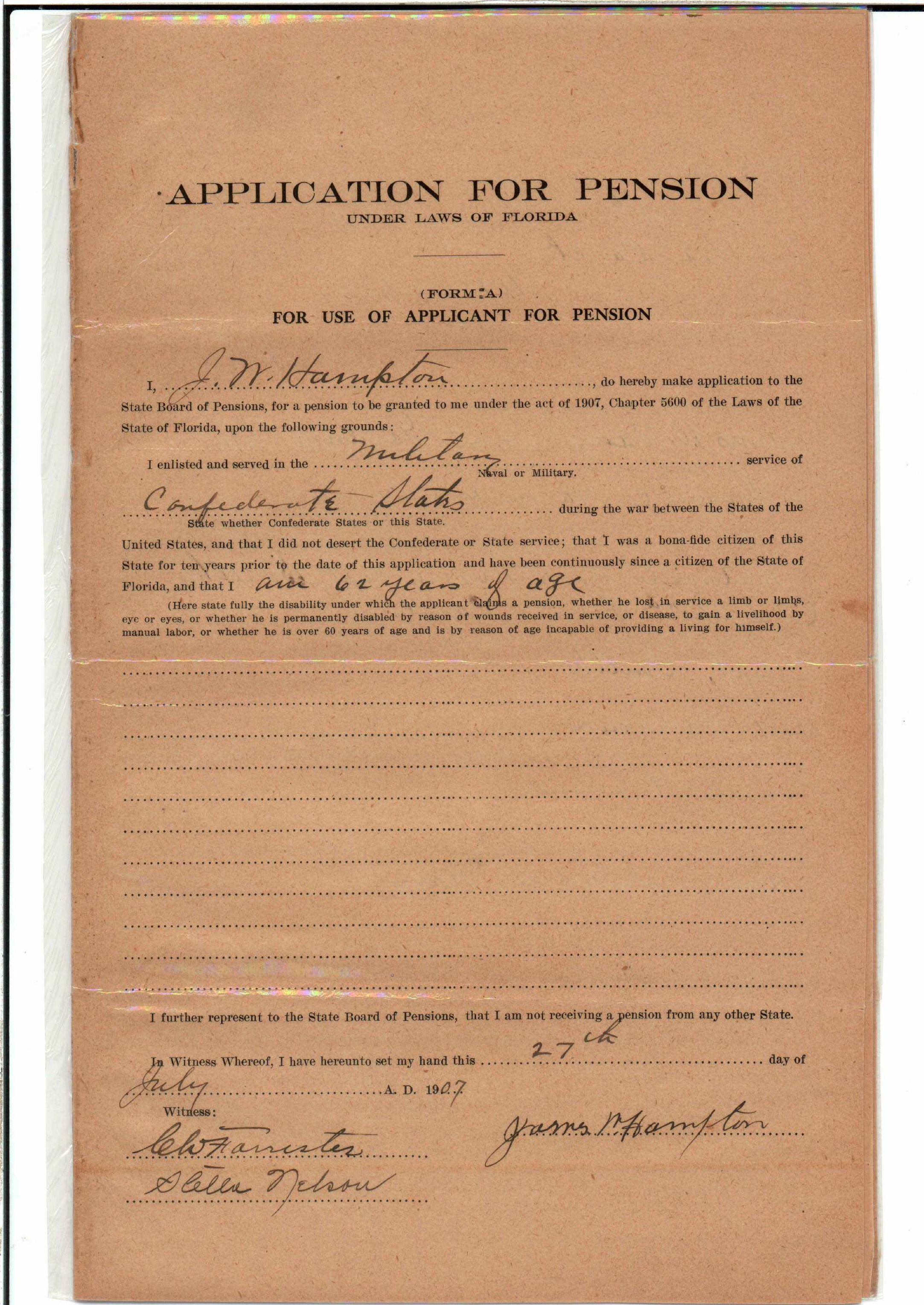 State Board of Pensions. HAMPTON, James W. 1907. State Archives of Florida, Florida Memory. <https://www.floridamemory.com/items/show/177844>, accessed 29 December 2025.