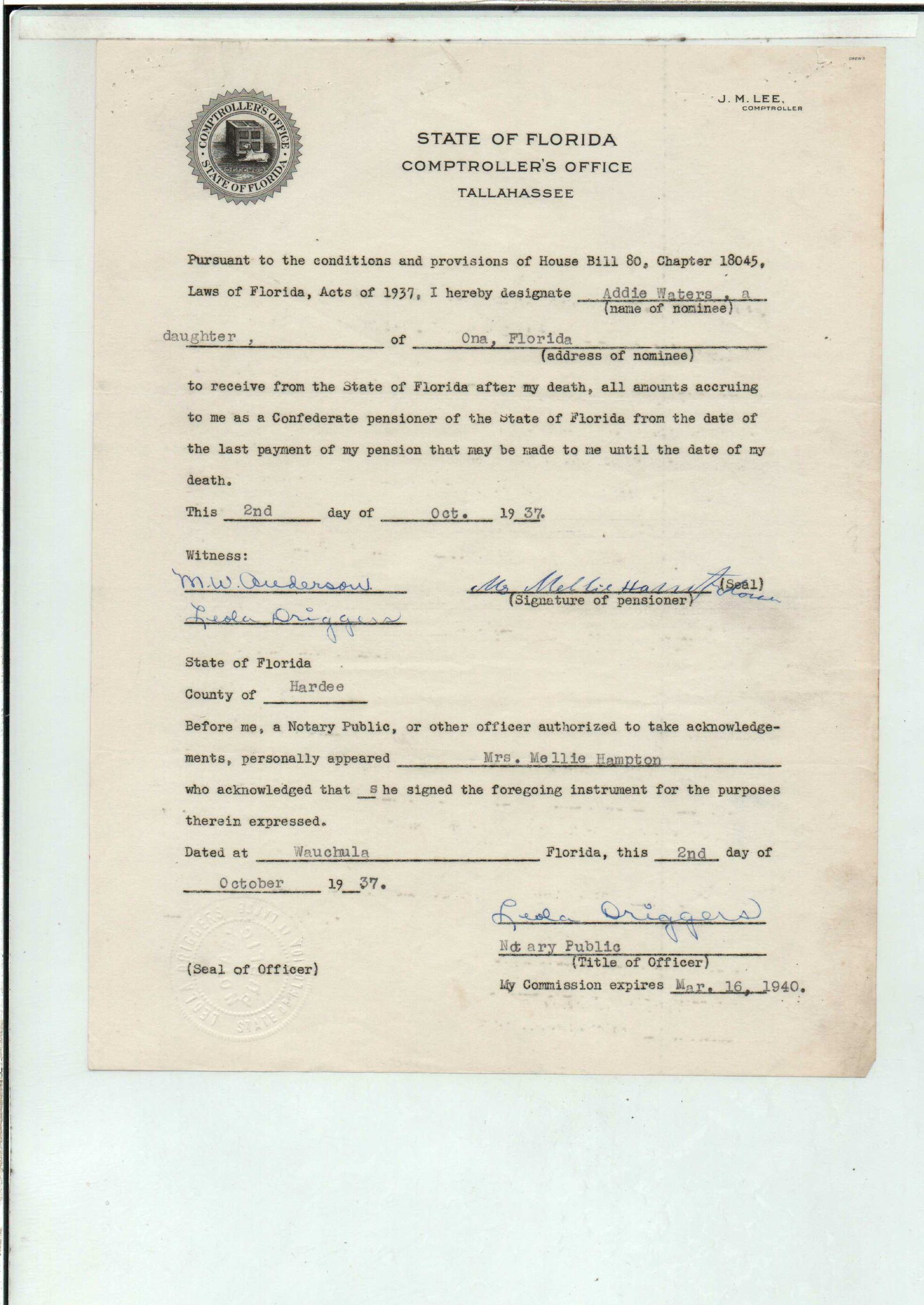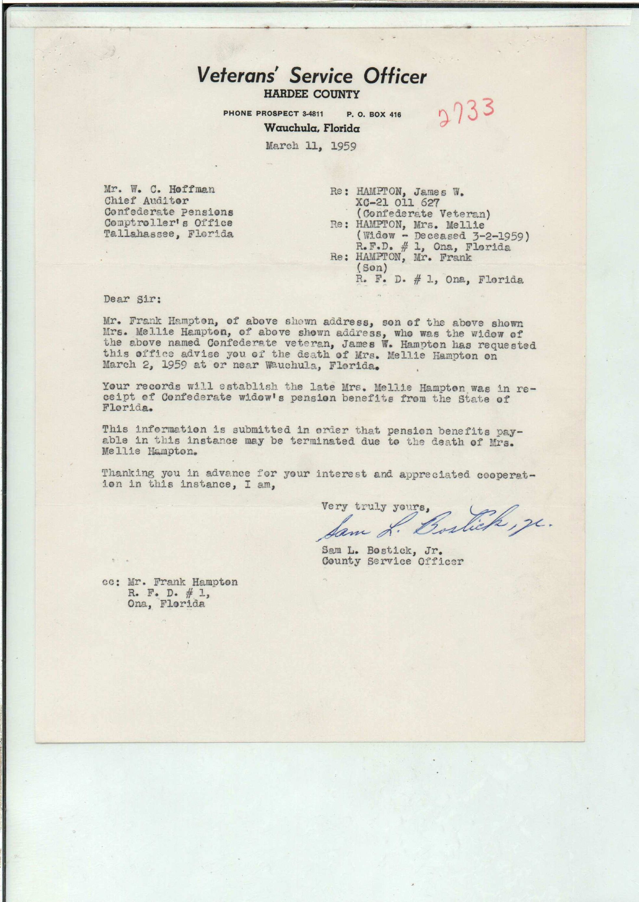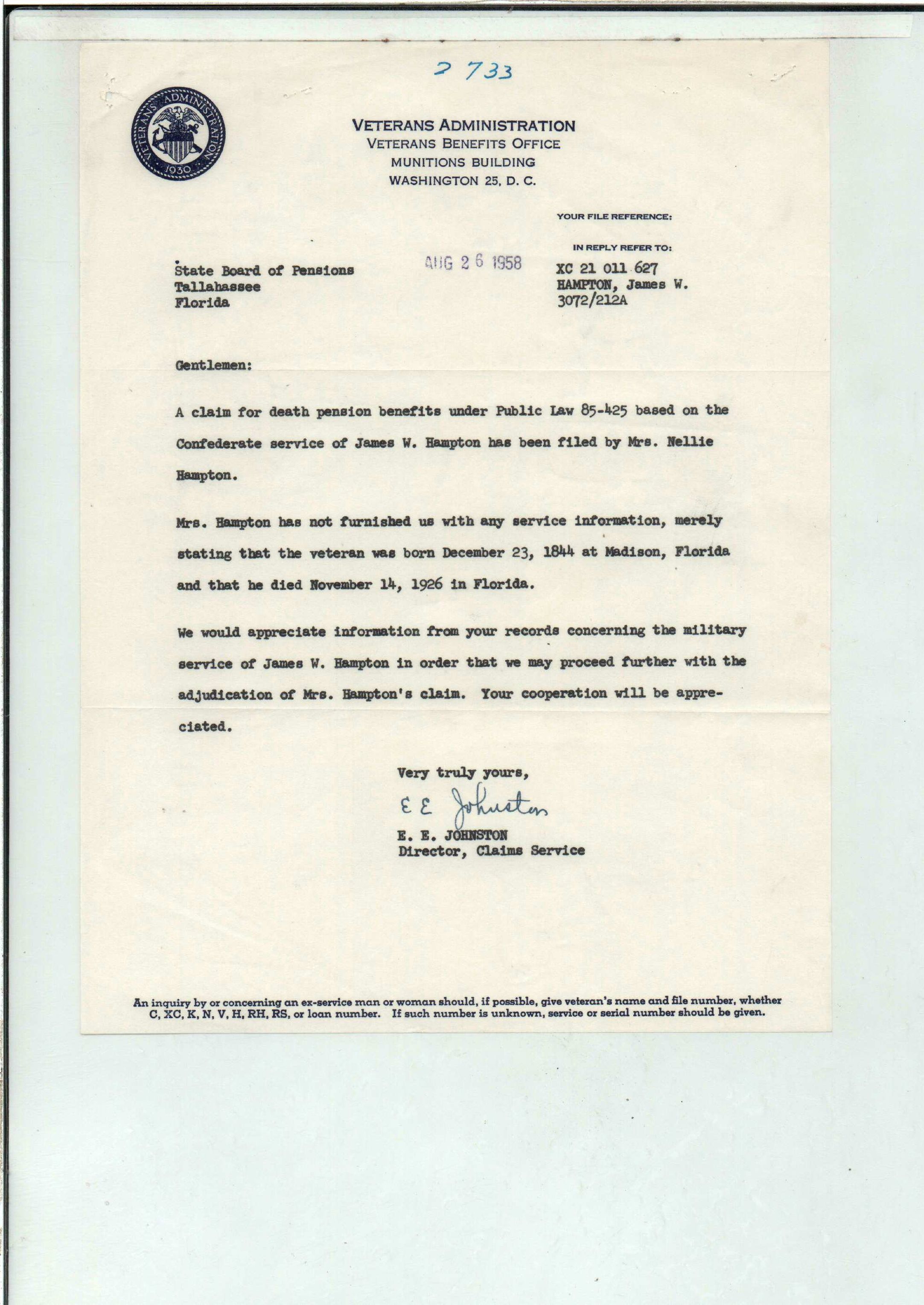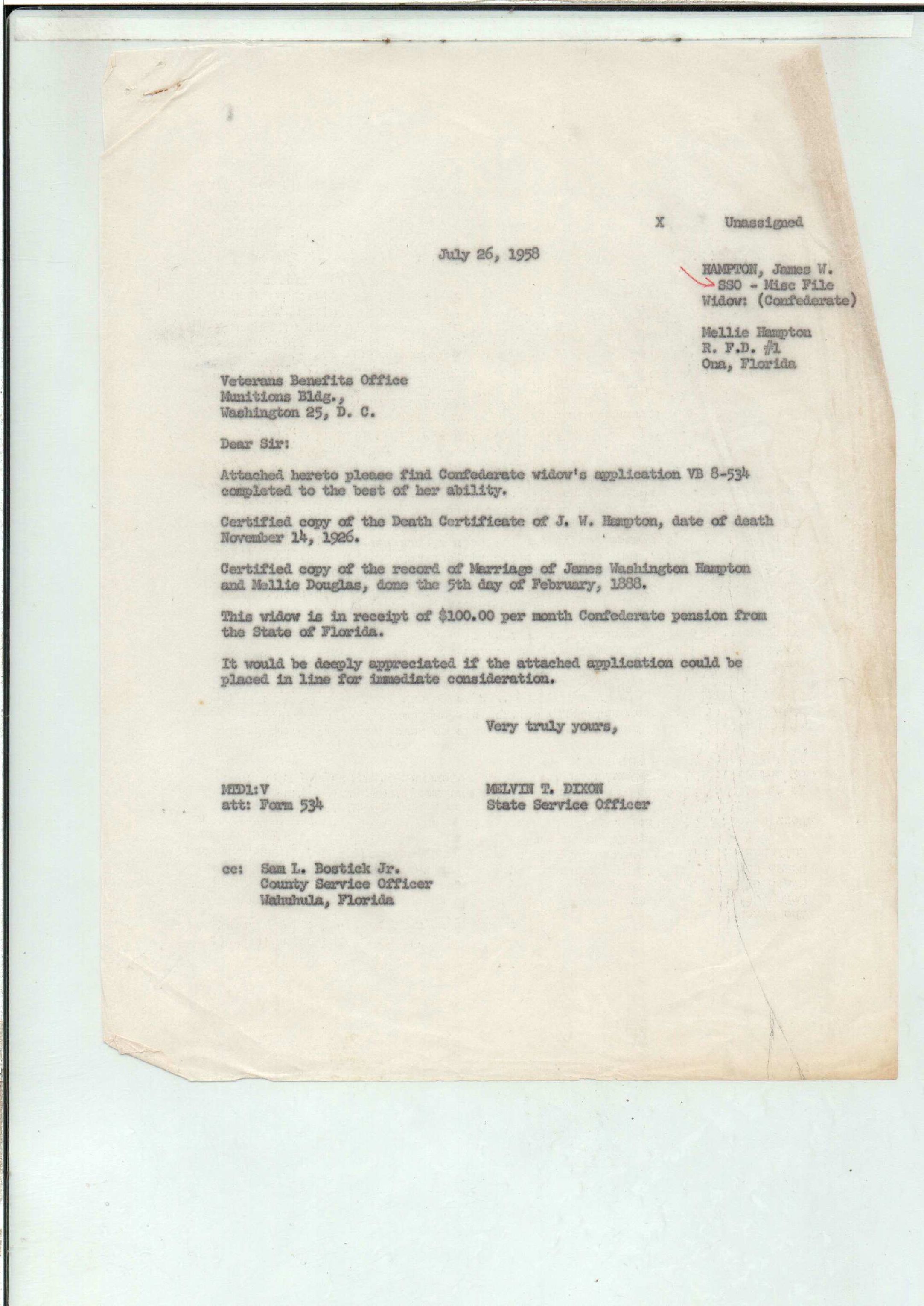 State Board of Pensions. HAMPTON, James W. 1907. State Archives of Florida, Florida Memory. <https://www.floridamemory.com/items/show/177844>, accessed 29 December 2025.