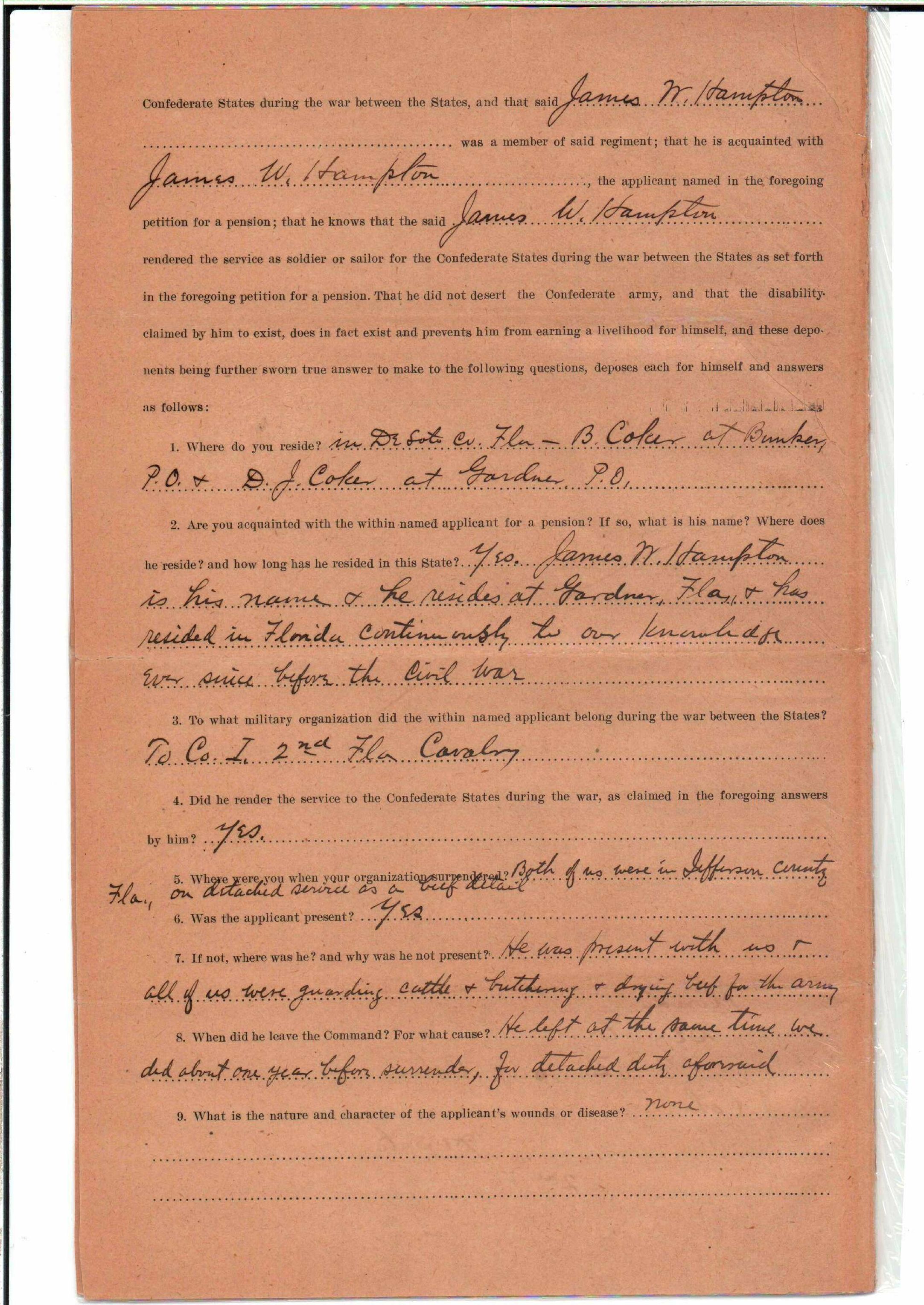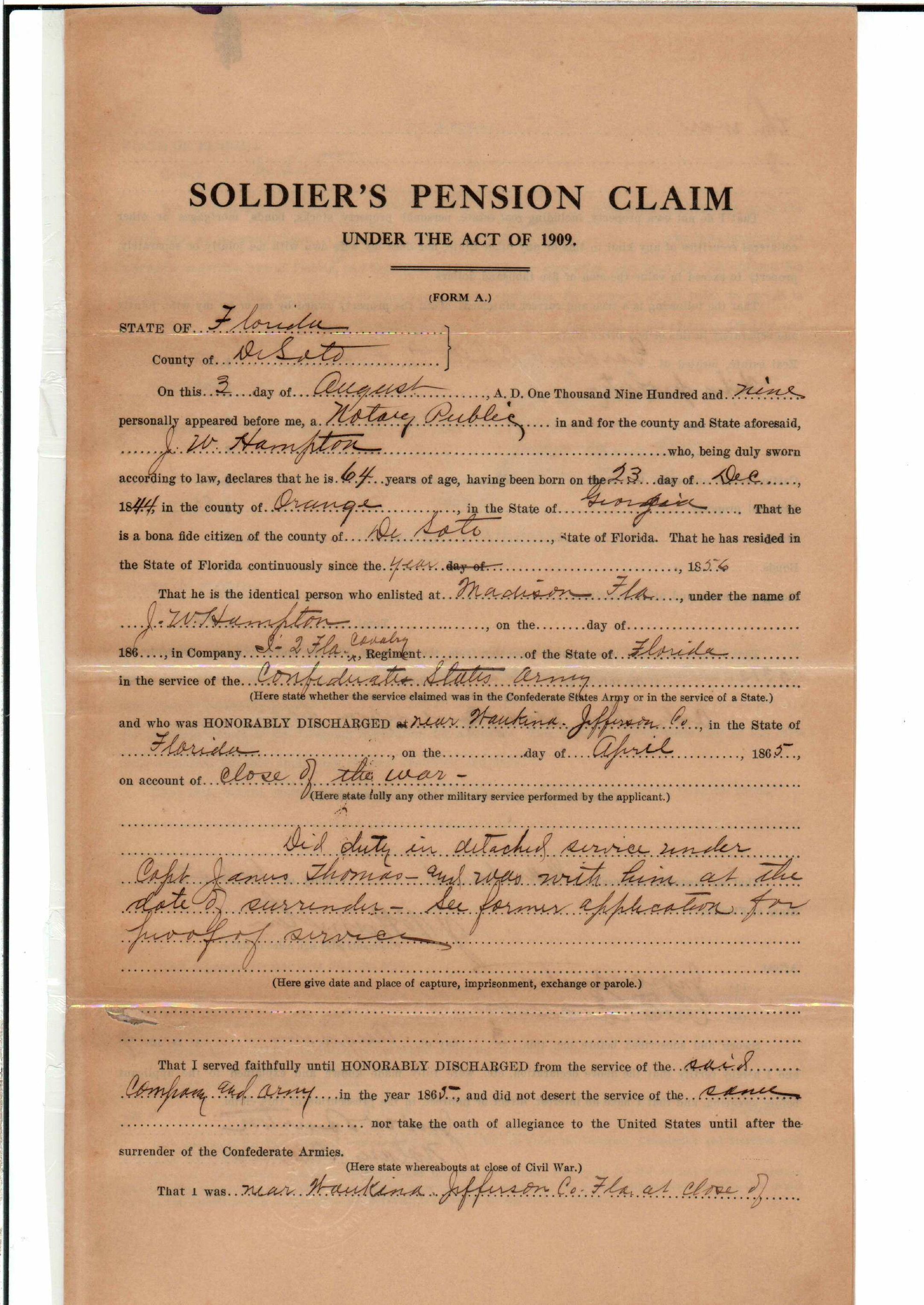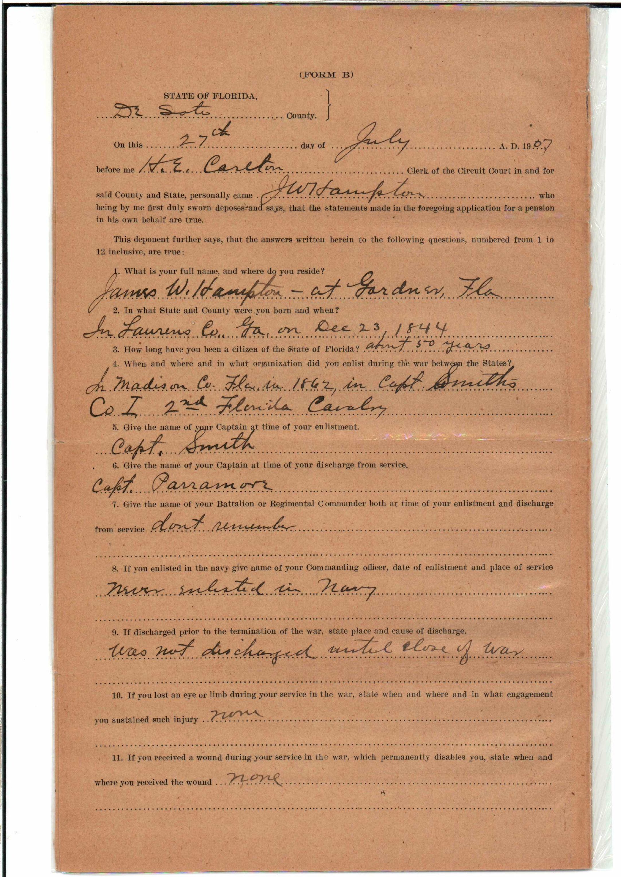 State Board of Pensions. HAMPTON, James W. 1907. State Archives of Florida, Florida Memory. Accessed 29 Dec. 2025.<https://www.floridamemory.com/items/show/177844>
