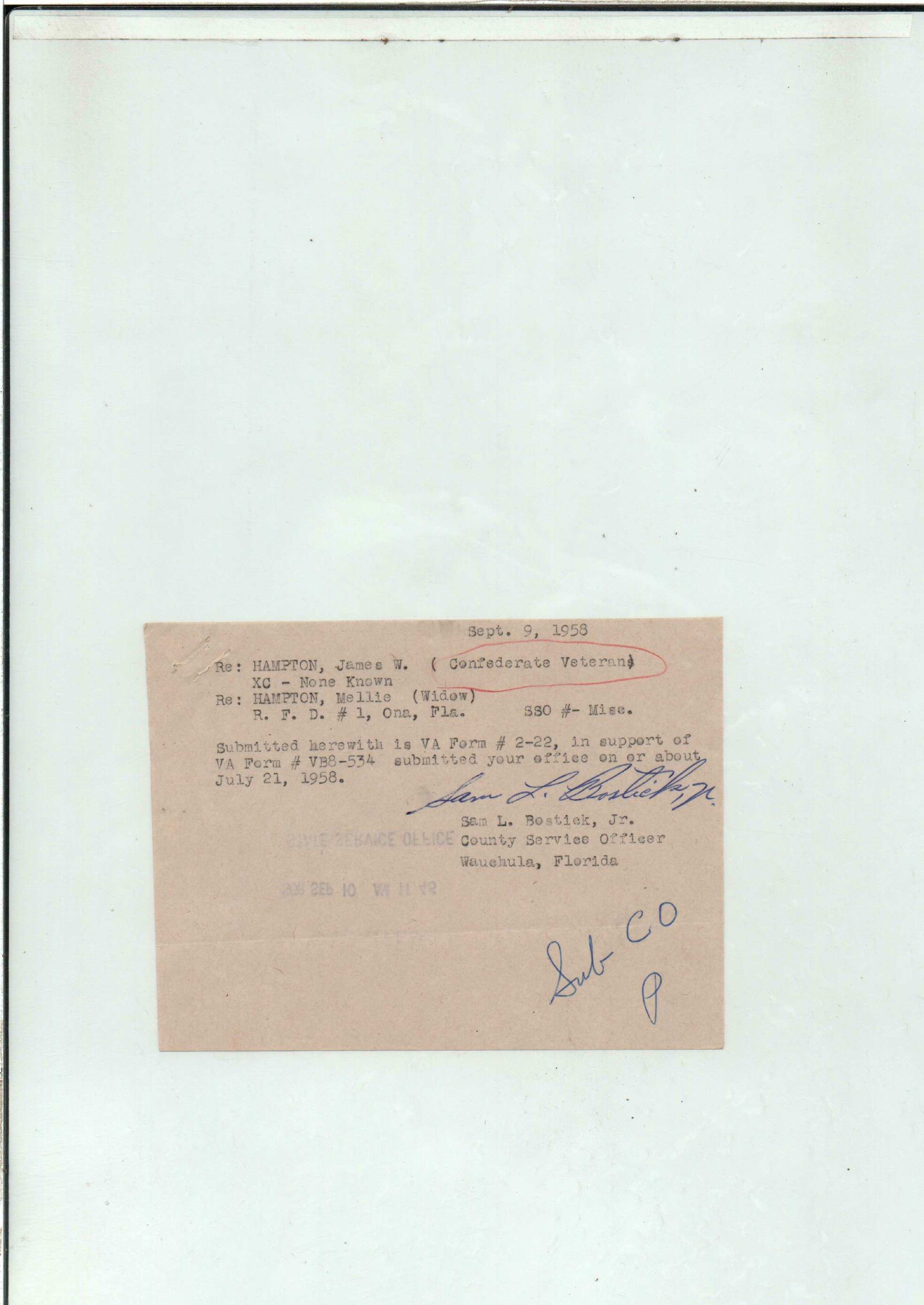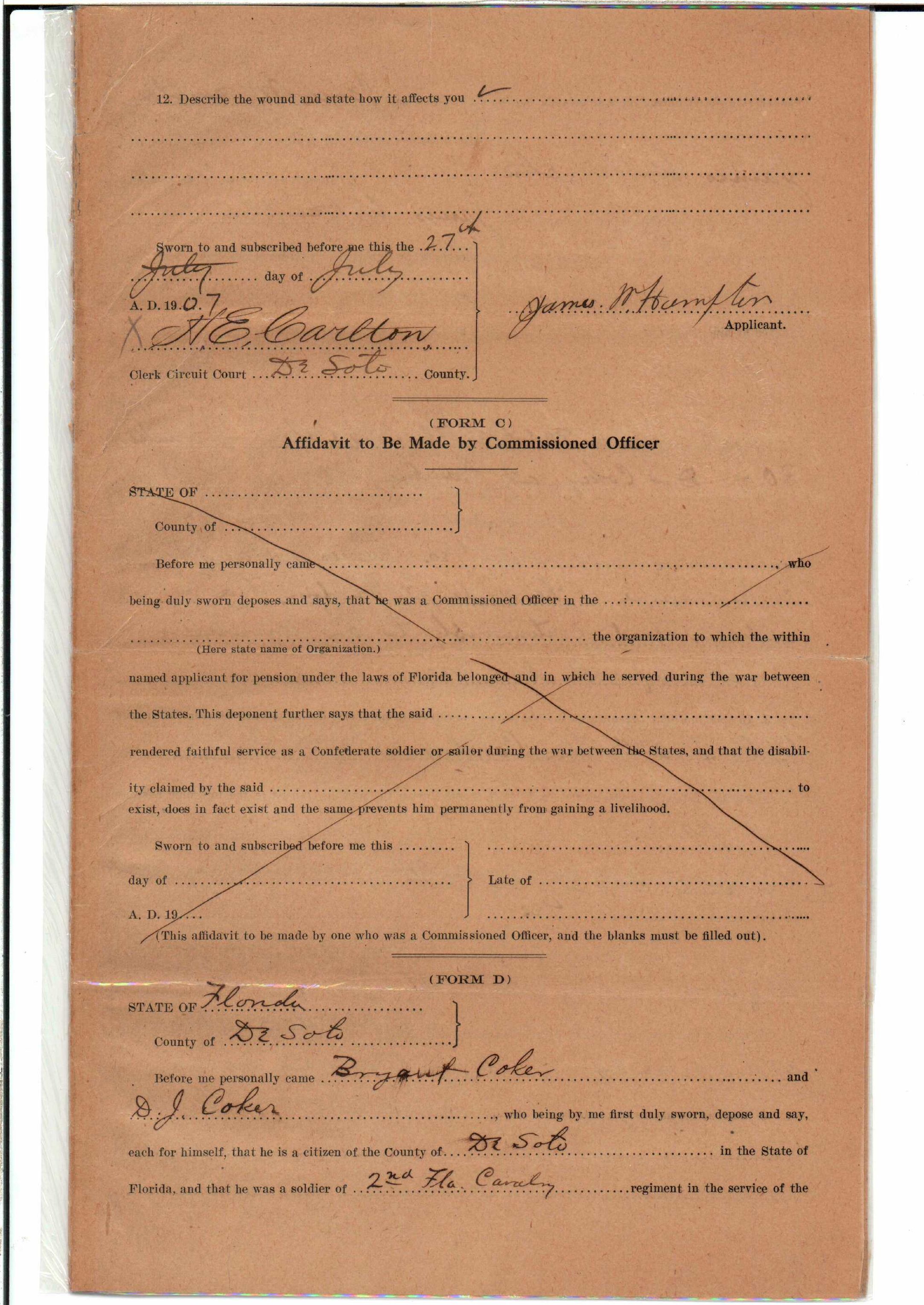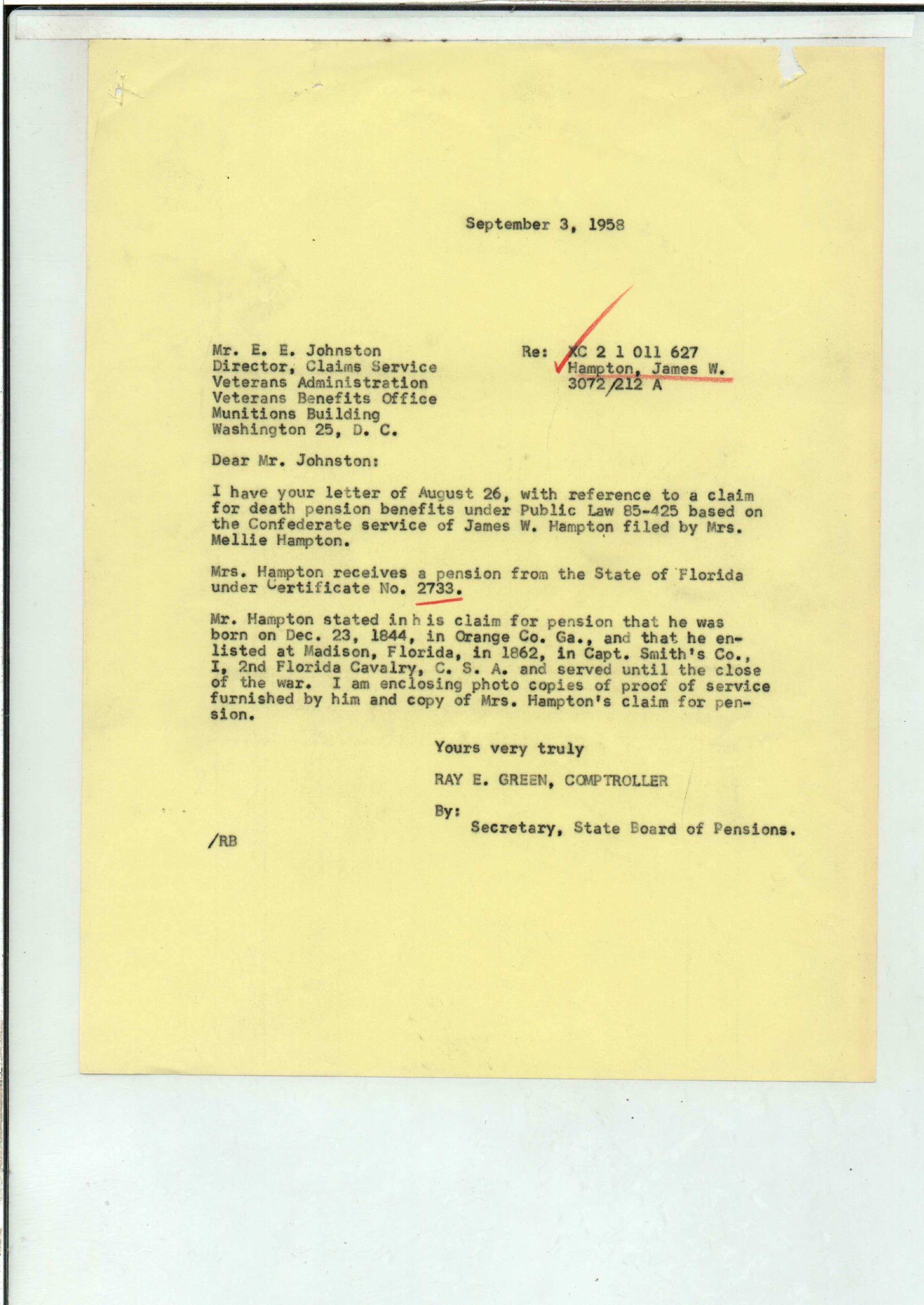 State Board of Pensions. HAMPTON, James W. 1907. State Archives of Florida, Florida Memory. Accessed 29 Dec. 2025.<https://www.floridamemory.com/items/show/177844>