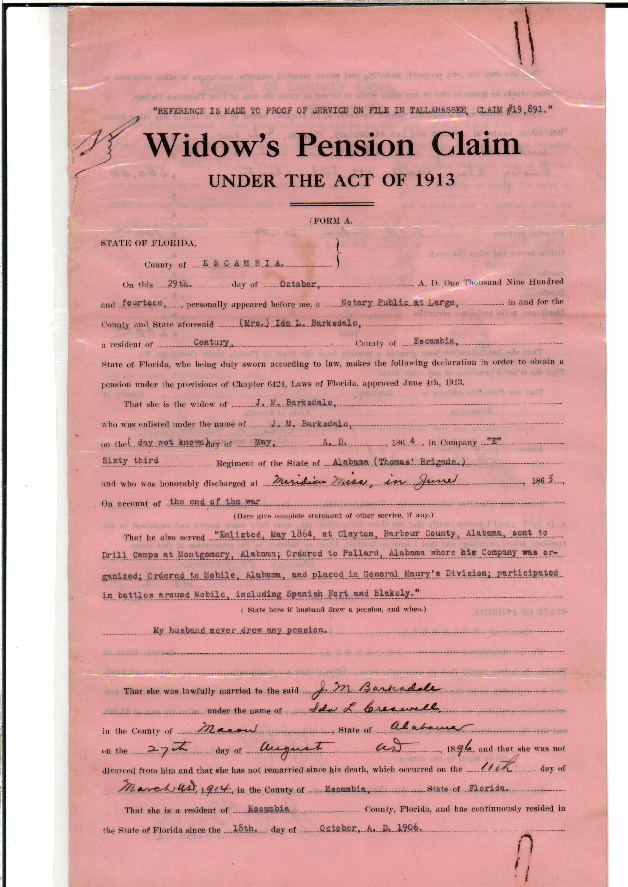 State Board of Pensions. BARKSDALE, John M. 1914. State Archives of Florida, Florida Memory. <https://www.floridamemory.com/items/show/180672>, accessed 28 November 2025.