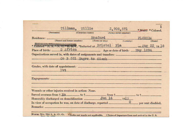 Florida. Military Dept. Willie Tillman. . State Archives of Florida, Florida Memory. Accessed 26 Dec. 2025.<https://www.floridamemory.com/items/show/189998>