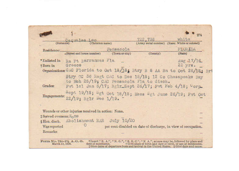 Florida. Military Dept. Leo Carvales. . State Archives of Florida, Florida Memory. <https://www.floridamemory.com/items/show/199432>, accessed 26 January 2026.