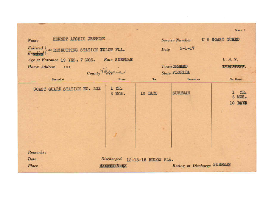 Florida. Military Dept. Archie Jestine Bennet. . State Archives of Florida, Florida Memory. Accessed 6 Dec. 2025.<https://www.floridamemory.com/items/show/209502>