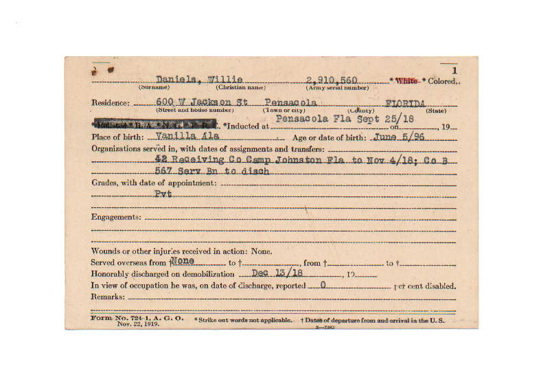 Florida. Military Dept. Willie Daniels. . State Archives of Florida, Florida Memory. Accessed 5 Feb. 2026.<https://www.floridamemory.com/items/show/210919>