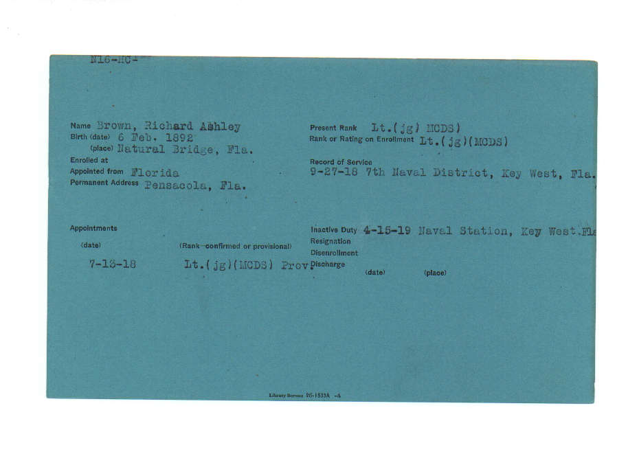 Florida. Military Dept. Richard Ashley Brown. . State Archives of Florida, Florida Memory. Accessed 5 Dec. 2025.<https://www.floridamemory.com/items/show/216506>