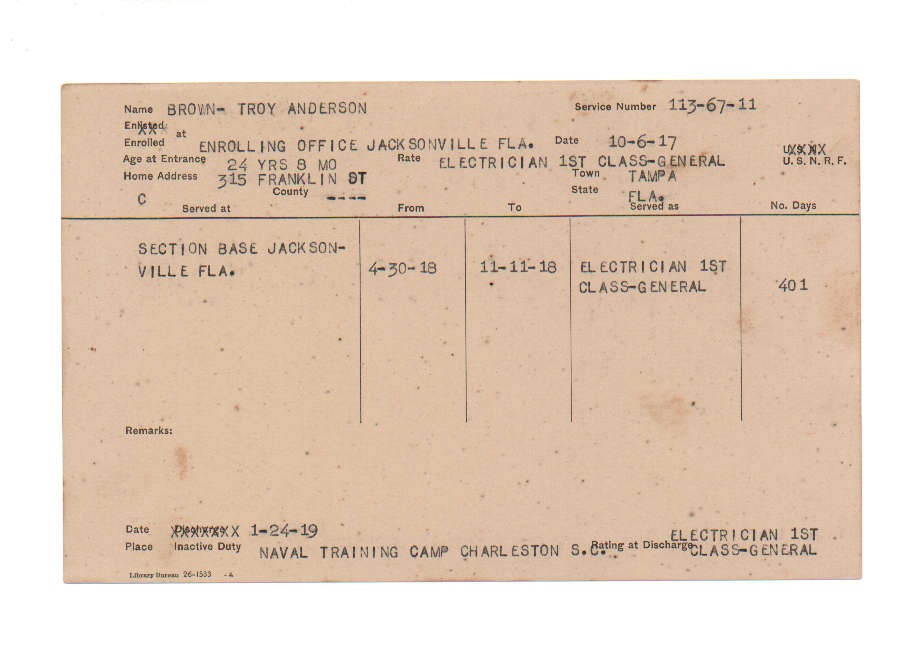 Florida. Military Dept. Troy Anderson Brown. . State Archives of Florida, Florida Memory. <https://www.floridamemory.com/items/show/216514>, accessed 6 December 2025.
