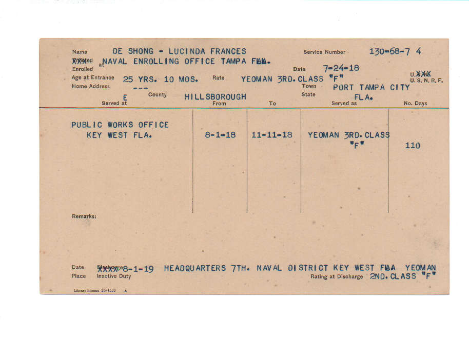 Florida. Military Dept. Lucinda Frances De Shong. . State Archives of Florida, Florida Memory. Accessed 2 Jan. 2026.<https://www.floridamemory.com/items/show/219202>