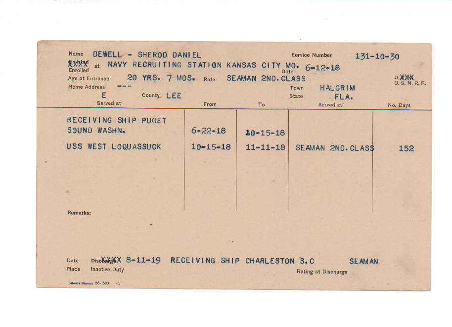 Florida. Military Dept. Sherod Daniel Dewell. . State Archives of Florida, Florida Memory. <https://www.floridamemory.com/items/show/219205>, accessed 2 January 2026.