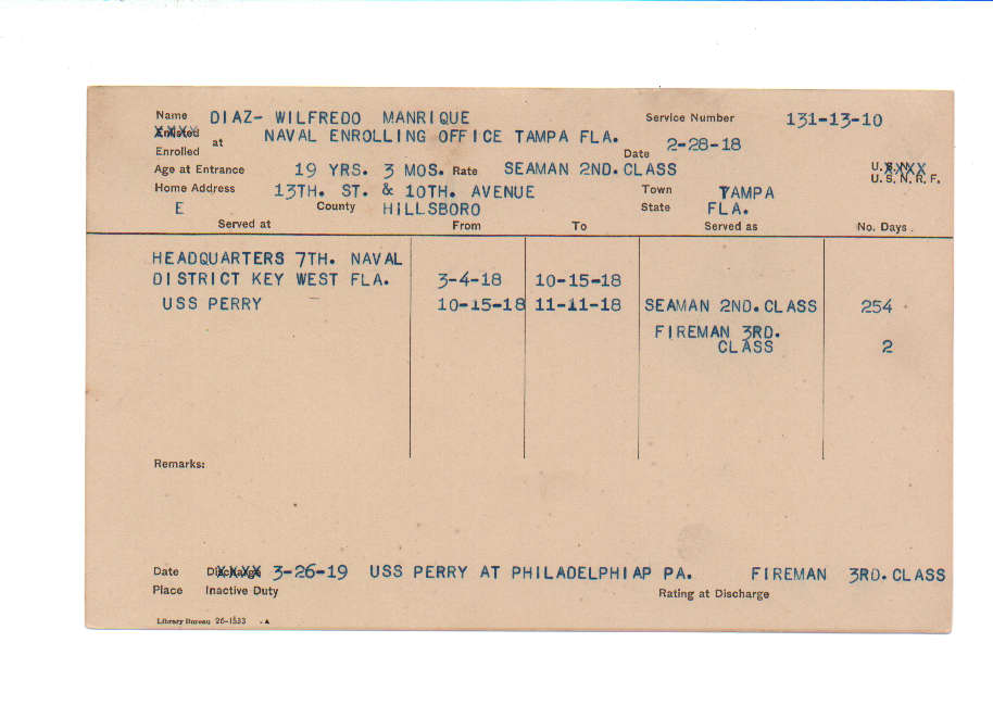 Florida. Military Dept. Wilfredo Manrique Diaz. . State Archives of Florida, Florida Memory. Accessed 1 Jan. 2026.<https://www.floridamemory.com/items/show/219212>