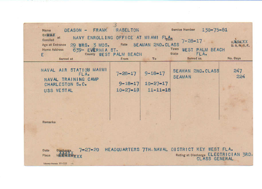 Florida. Military Dept. Frank Braselton Deason. . State Archives of Florida, Florida Memory. <https://www.floridamemory.com/items/show/219223>, accessed 31 December 2025.