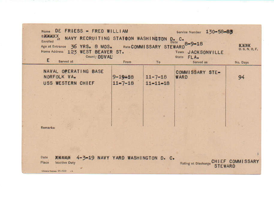 Florida. Military Dept. Fred William De Friess. . State Archives of Florida, Florida Memory. <https://www.floridamemory.com/items/show/219230>, accessed 31 December 2025.