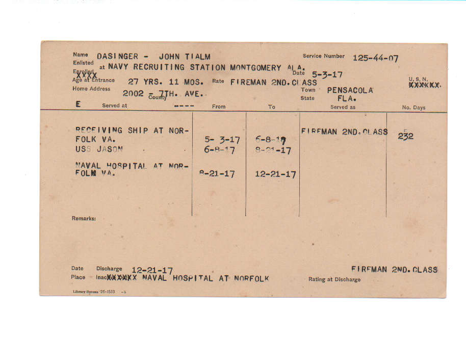 Florida. Military Dept. John Tialm Dasinger. . State Archives of Florida, Florida Memory. <https://www.floridamemory.com/items/show/219297>, accessed 25 December 2025.