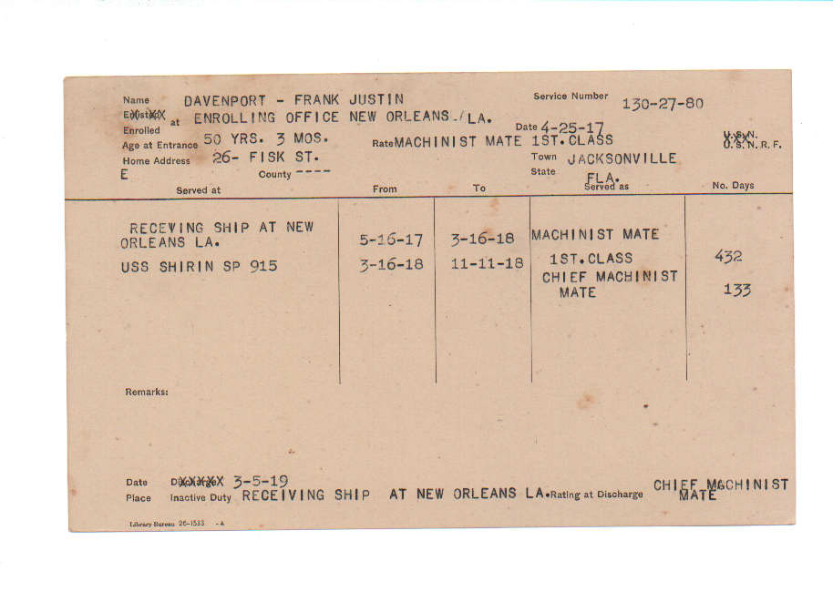 Florida. Military Dept. Frank Justin Davenport. . State Archives of Florida, Florida Memory. <https://www.floridamemory.com/items/show/219301>, accessed 25 December 2025.