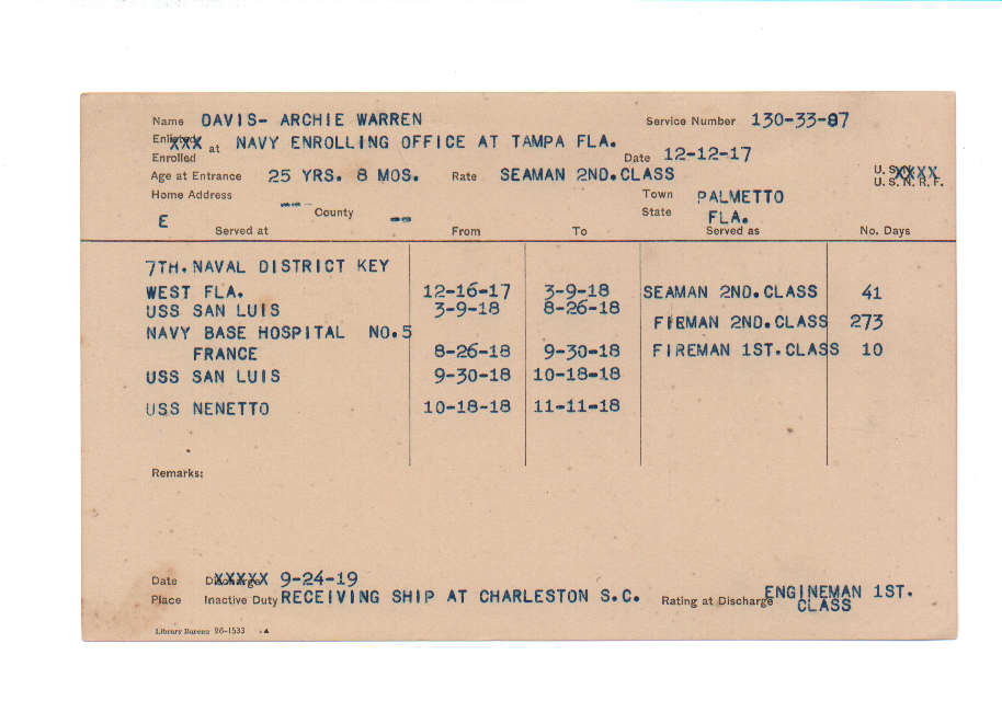Florida. Military Dept. Archie Warren Davis. . State Archives of Florida, Florida Memory. <https://www.floridamemory.com/items/show/219308>, accessed 24 December 2025.