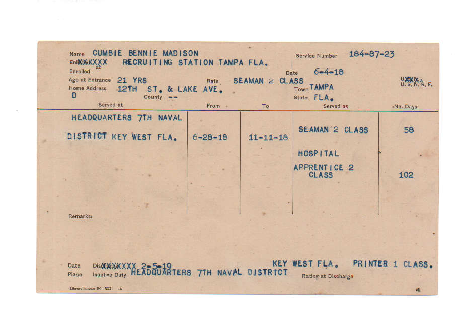 Florida. Military Dept. Bennie Madison Cumbie. . State Archives of Florida, Florida Memory. Accessed 24 Dec. 2025.<https://www.floridamemory.com/items/show/219317>