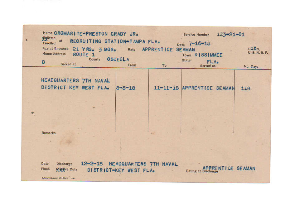 Florida. Military Dept. Preston Grady Comarite. . State Archives of Florida, Florida Memory. Accessed 20 Dec. 2025.<https://www.floridamemory.com/items/show/219360>