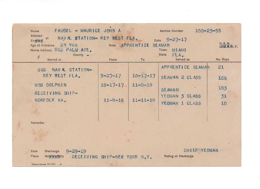 Florida. Military Dept. Maurice John A Faudel. . State Archives of Florida, Florida Memory. Accessed 10 Dec. 2025.<https://www.floridamemory.com/items/show/221290>