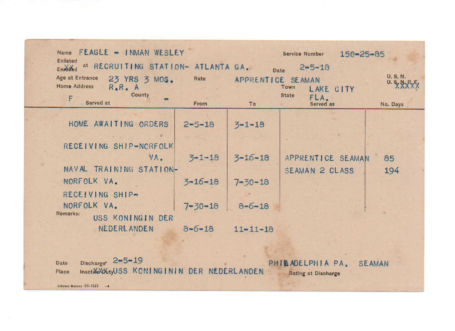 Florida. Military Dept. Inman Wesley Feagle. . State Archives of Florida, Florida Memory. <https://www.floridamemory.com/items/show/221299>, accessed 6 December 2025.