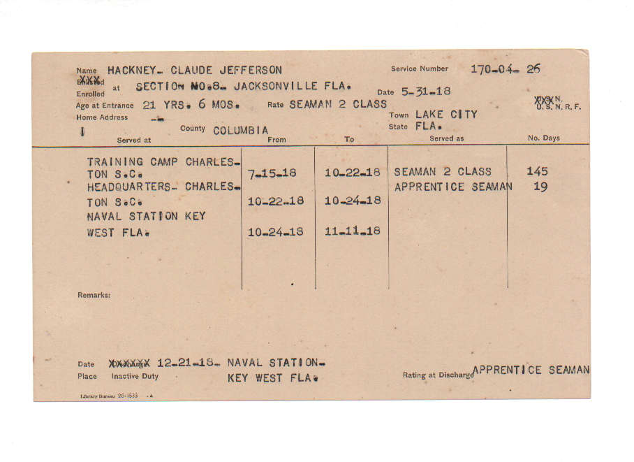 Florida. Military Dept. Claude Jefferson Hackney. . State Archives of Florida, Florida Memory. <https://www.floridamemory.com/items/show/221350>, accessed 19 December 2025.