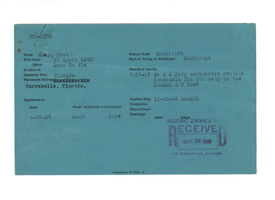 Florida. Military Dept. Fred Gray. . State Archives of Florida, Florida Memory. Accessed 20 Dec. 2025.<https://www.floridamemory.com/items/show/221357>