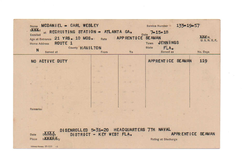 Florida. Military Dept. Carl Wesley McDaniel. . State Archives of Florida, Florida Memory. Accessed 26 Dec. 2025.<https://www.floridamemory.com/items/show/224743>