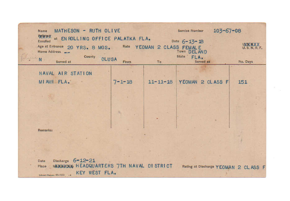 Florida. Military Dept. Ruth Olive Matheson. . State Archives of Florida, Florida Memory. Accessed 1 Jan. 2026.<https://www.floridamemory.com/items/show/224837>
