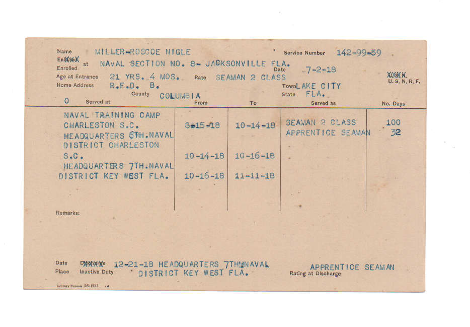 Florida. Military Dept. Roscoe Nigle Miller. . State Archives of Florida, Florida Memory. Accessed 5 Dec. 2025.<https://www.floridamemory.com/items/show/225370>