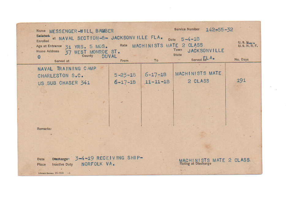 Florida. Military Dept. Will Bamber Messenger. . State Archives of Florida, Florida Memory. <https://www.floridamemory.com/items/show/225383>, accessed 6 December 2025.