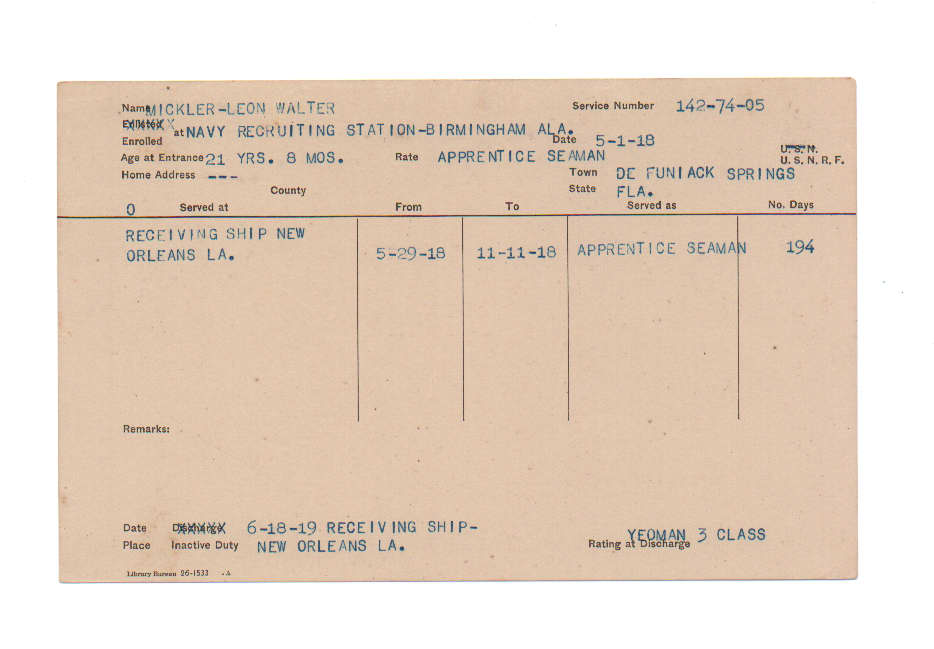Florida. Military Dept. Leon Walter Mickler. . State Archives of Florida, Florida Memory. <https://www.floridamemory.com/items/show/225401>, accessed 13 December 2025.