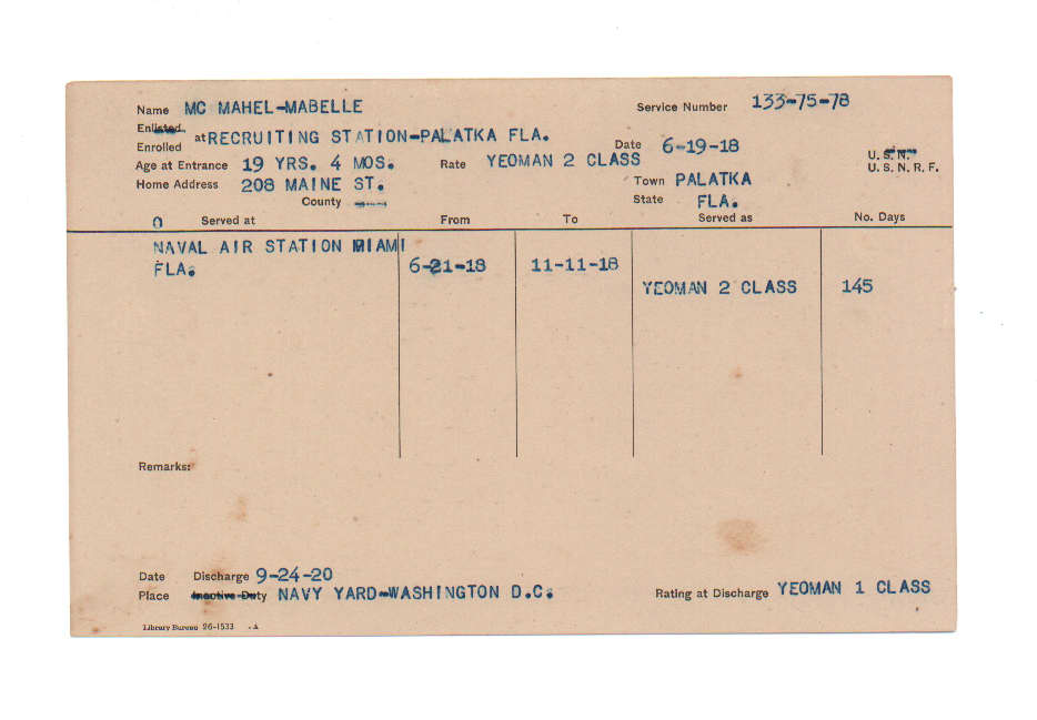 Florida. Military Dept. Mabelle McMahel. . State Archives of Florida, Florida Memory. Accessed 23 Dec. 2025.<https://www.floridamemory.com/items/show/225451>