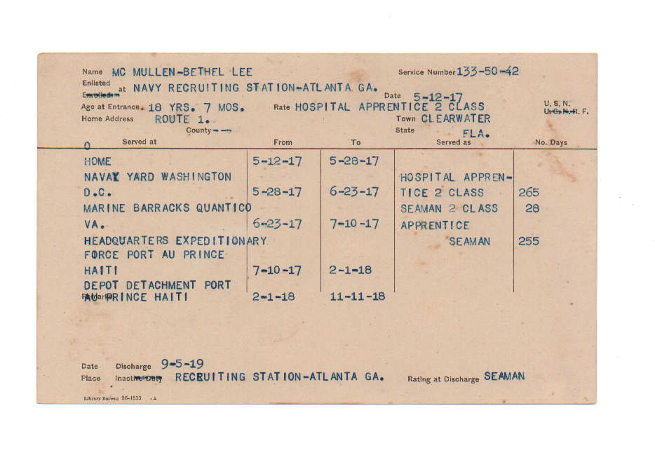 Florida. Military Dept. Bethel Lee McMullen. . State Archives of Florida, Florida Memory. Accessed 23 Dec. 2025.<https://www.floridamemory.com/items/show/225457>