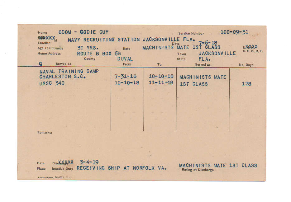 Florida. Military Dept. Codie Guy Odom. . State Archives of Florida, Florida Memory. Accessed 29 Dec. 2025.<https://www.floridamemory.com/items/show/225515>