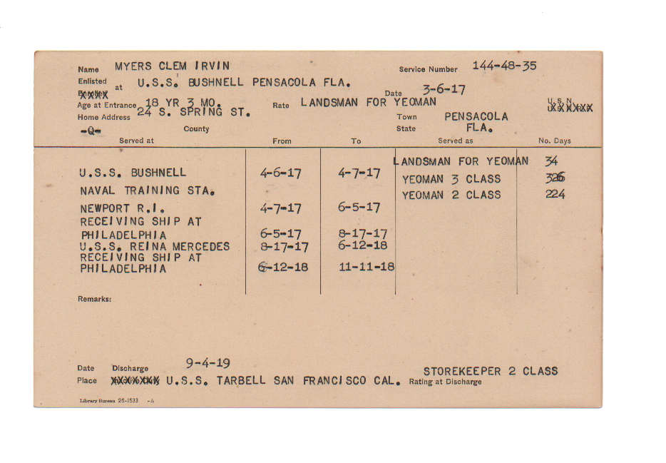 Florida. Military Dept. Clem Irvin Myers. . State Archives of Florida, Florida Memory. <https://www.floridamemory.com/items/show/225553>, accessed 1 January 2026.