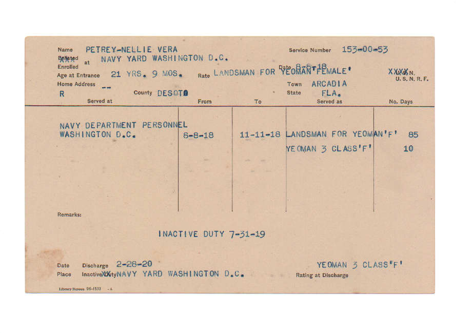 Florida. Military Dept. Nellie Vera Petrey. . State Archives of Florida, Florida Memory. Accessed 6 Dec. 2025.<https://www.floridamemory.com/items/show/226271>