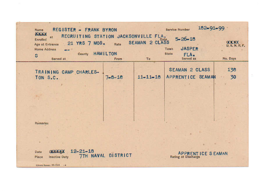 Florida. Military Dept. Frank Bryon Register. . State Archives of Florida, Florida Memory. Accessed 6 Dec. 2025.<https://www.floridamemory.com/items/show/226450>