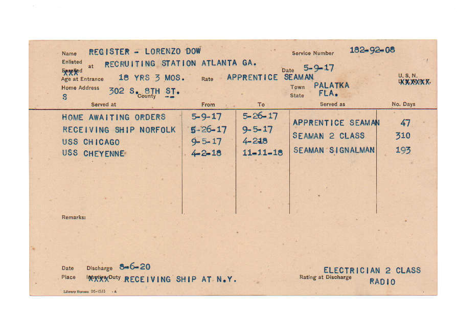 Florida. Military Dept. Lorenzo Dow Register. . State Archives of Florida, Florida Memory. Accessed 6 Dec. 2025.<https://www.floridamemory.com/items/show/226454>