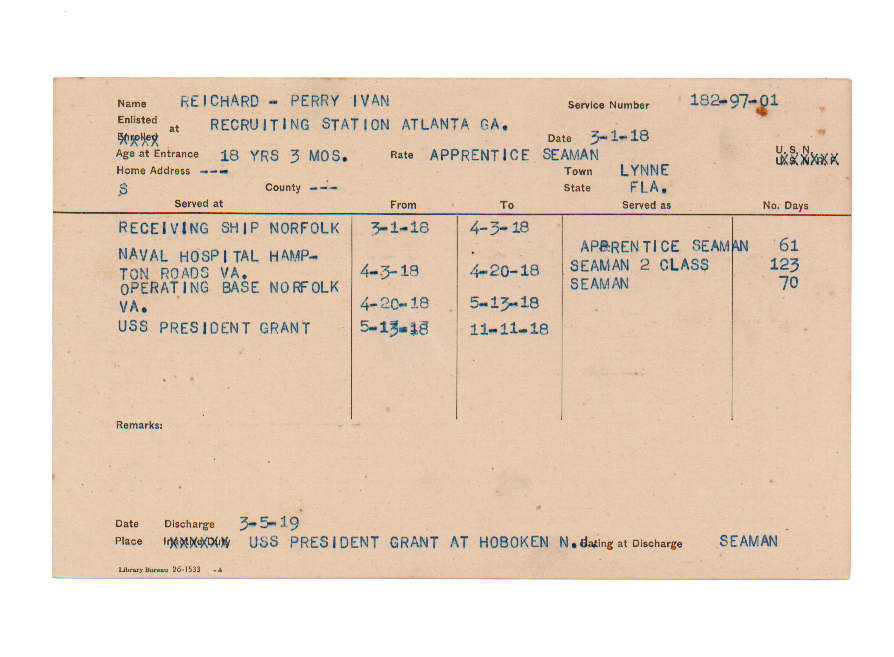 Florida. Military Dept. Perry Ivan Reichard. . State Archives of Florida, Florida Memory. Accessed 6 Dec. 2025.<https://www.floridamemory.com/items/show/226458>