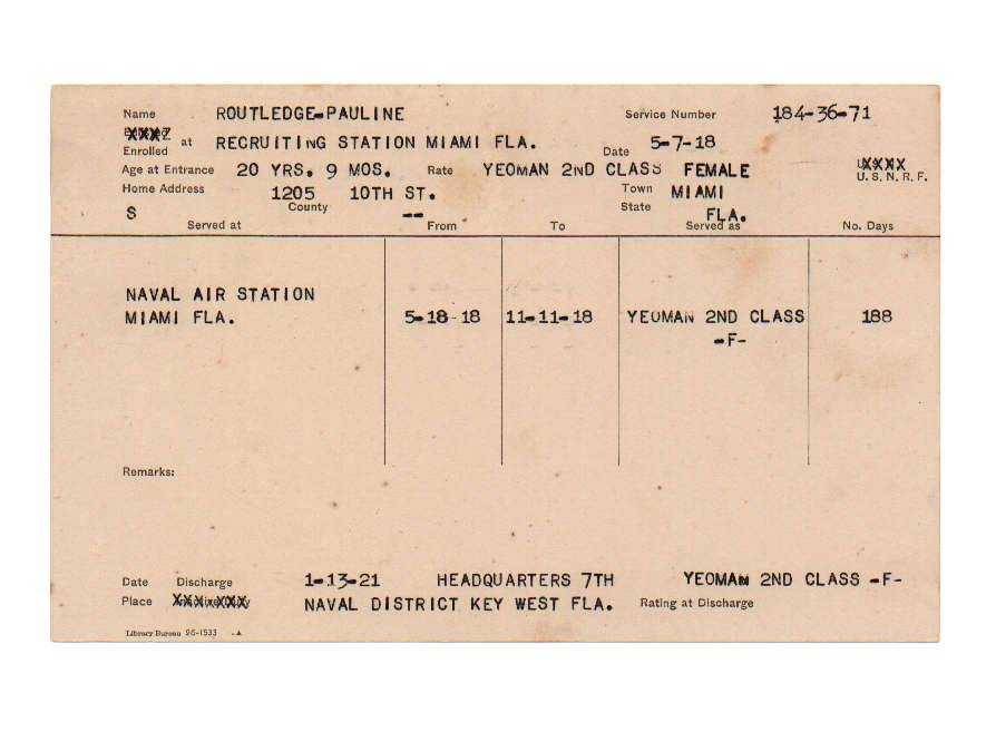 Florida. Military Dept. Pauline Routledge. . State Archives of Florida, Florida Memory. Accessed 6 Dec. 2025.<https://www.floridamemory.com/items/show/226667>