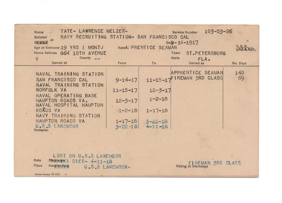 Florida. Military Dept. Lawrence Melzer Tate. . State Archives of Florida, Florida Memory. <https://www.floridamemory.com/items/show/229668>, accessed 1 January 2026.