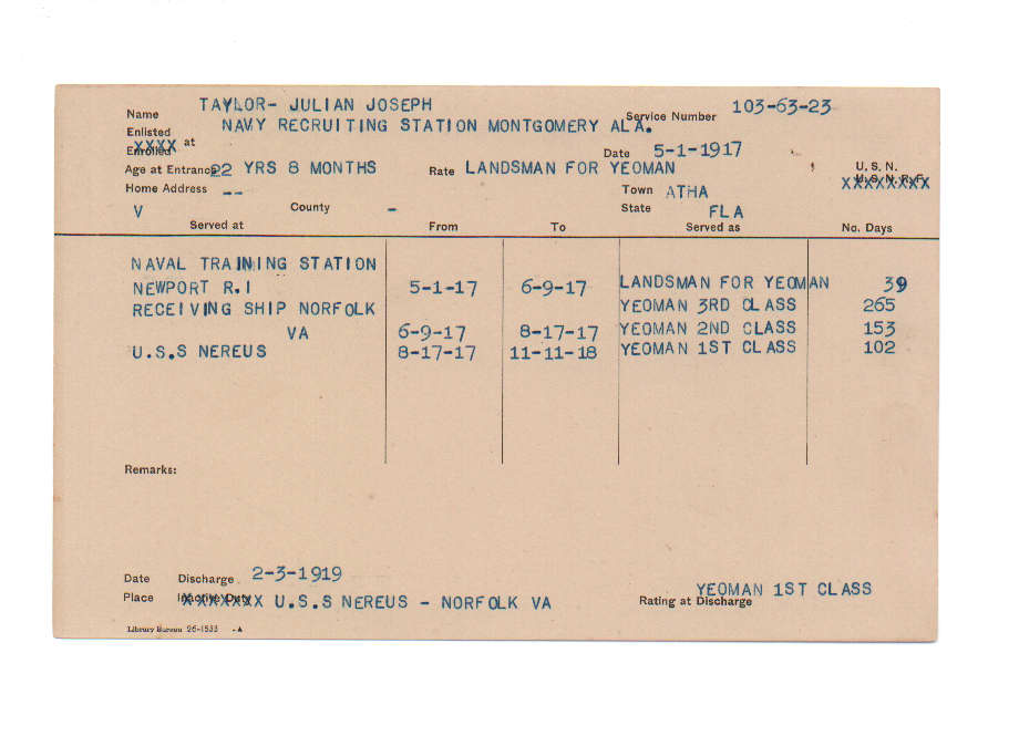 Florida. Military Dept. Julian Joseph Taylor. . State Archives of Florida, Florida Memory. <https://www.floridamemory.com/items/show/229680>, accessed 31 December 2025.