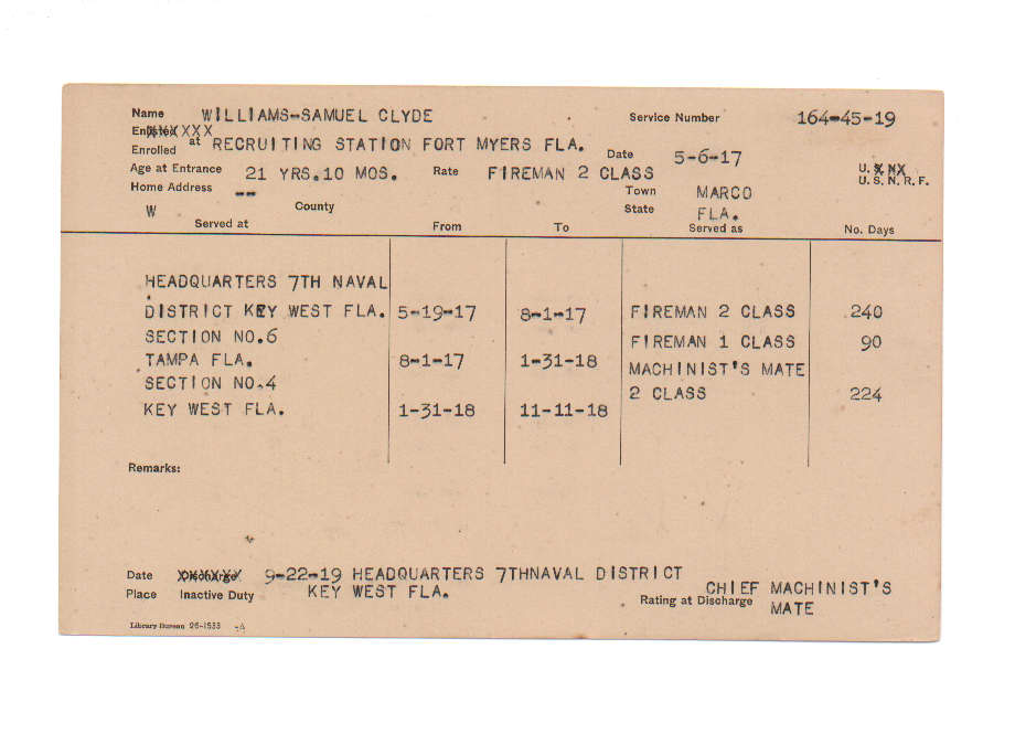 Florida. Military Dept. Samuel Clyde Williams. . State Archives of Florida, Florida Memory. Accessed 21 Dec. 2025.<https://www.floridamemory.com/items/show/230824>